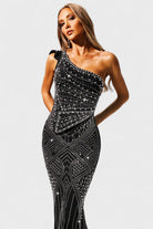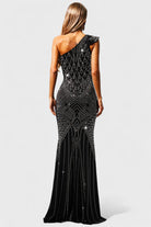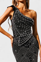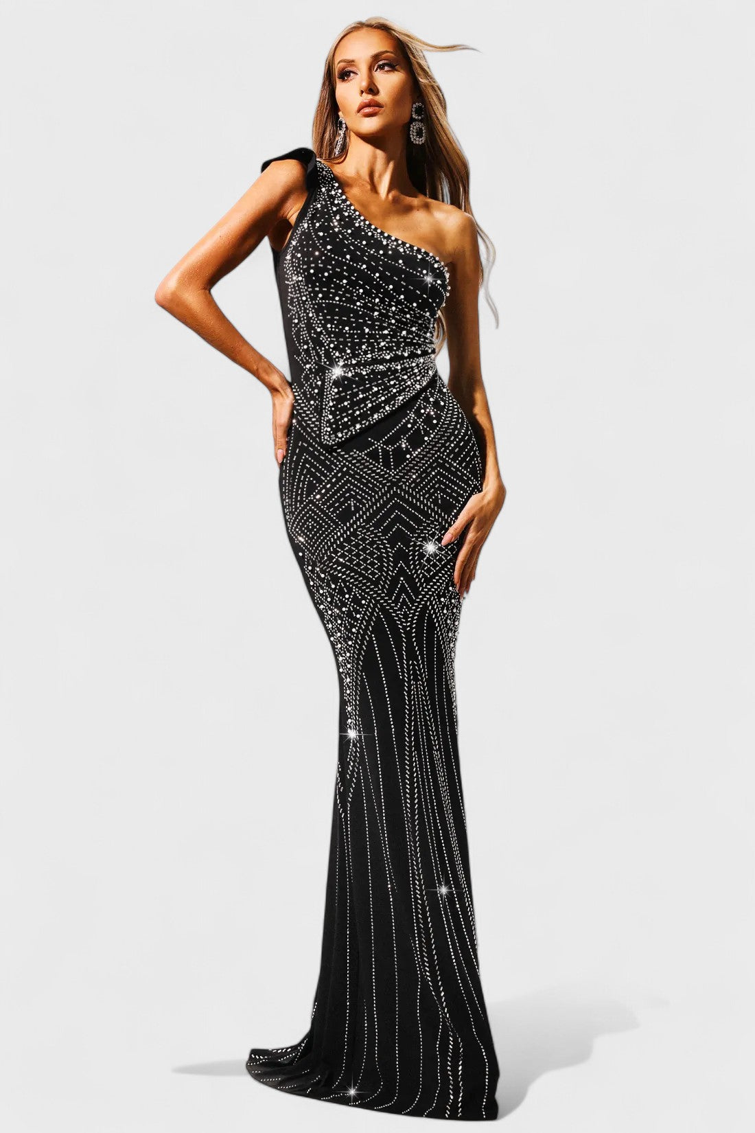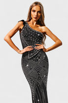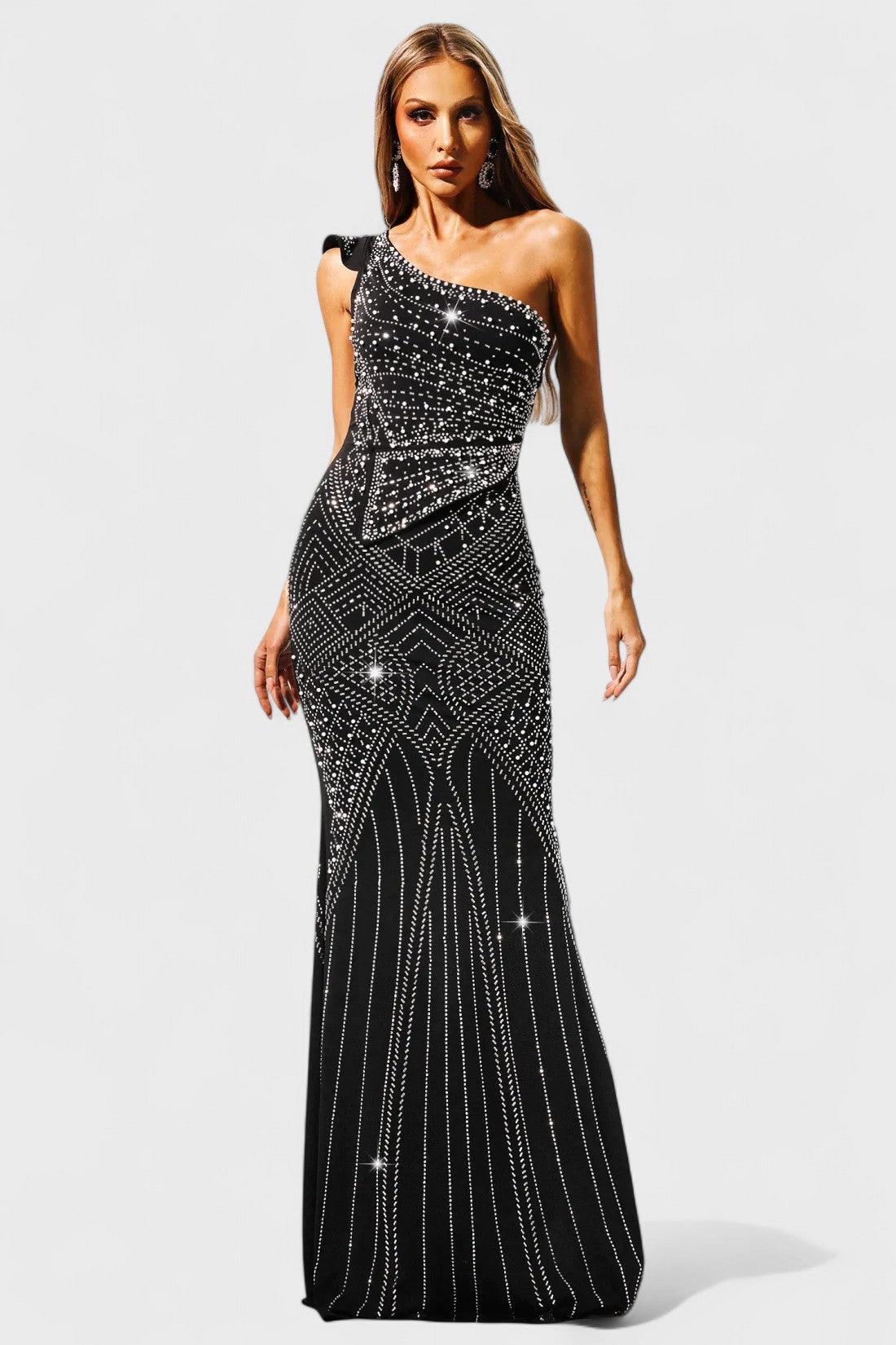 فستان ماكسي أسود بأكمام واحدة مزين بالترتر