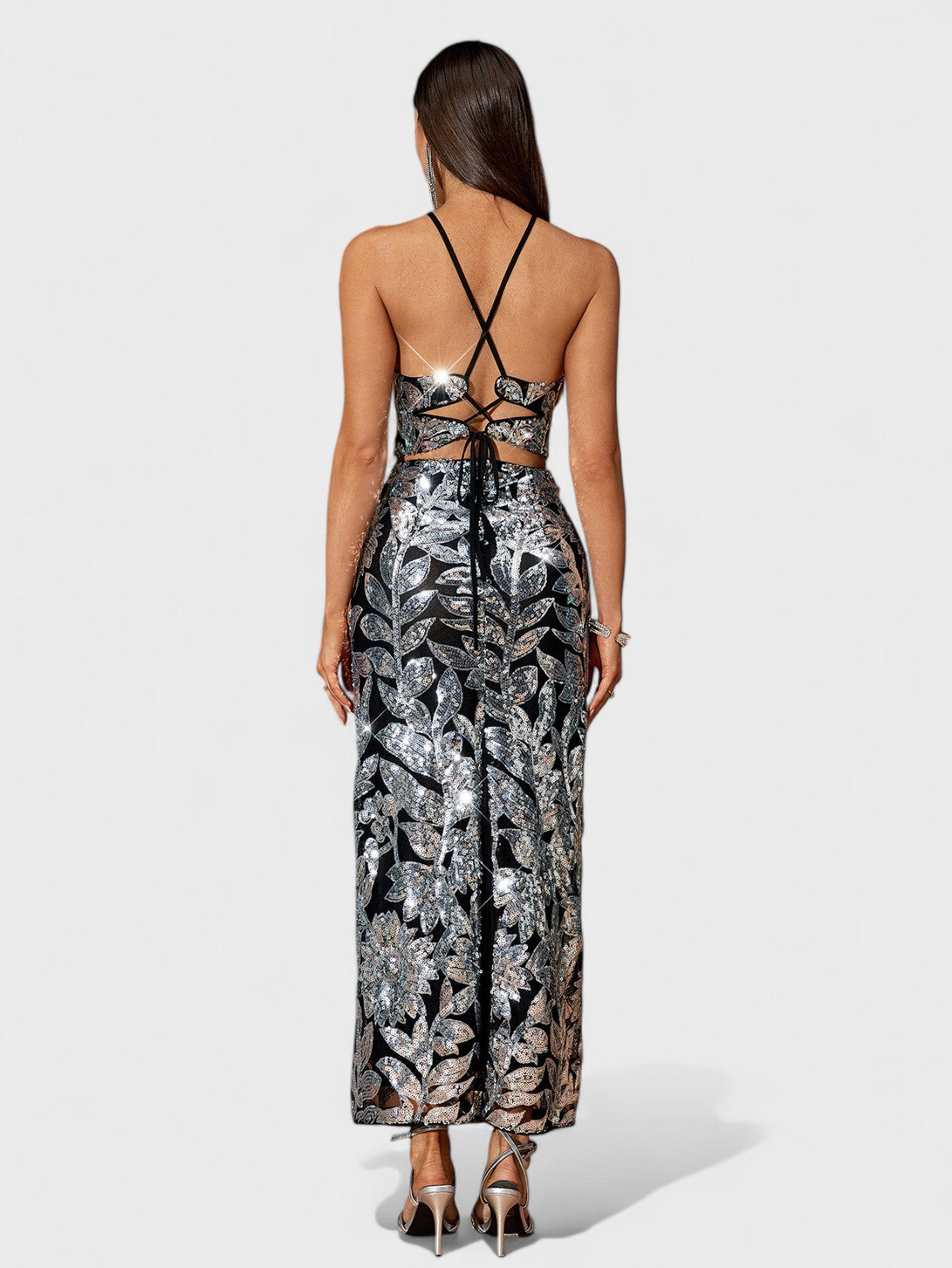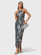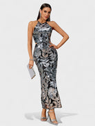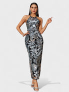 The Claudette Dress is a dazzling statement piece designed to shine. Featuring a halter neckline and an open strappy back, it is covered in metallic silver floral sequins over a black base for a striking contrast. The body-hugging fit elongates the silhouette, while the ankle-grazing length makes it perfect for evening galas, cocktail parties, or any glamorous occasion.