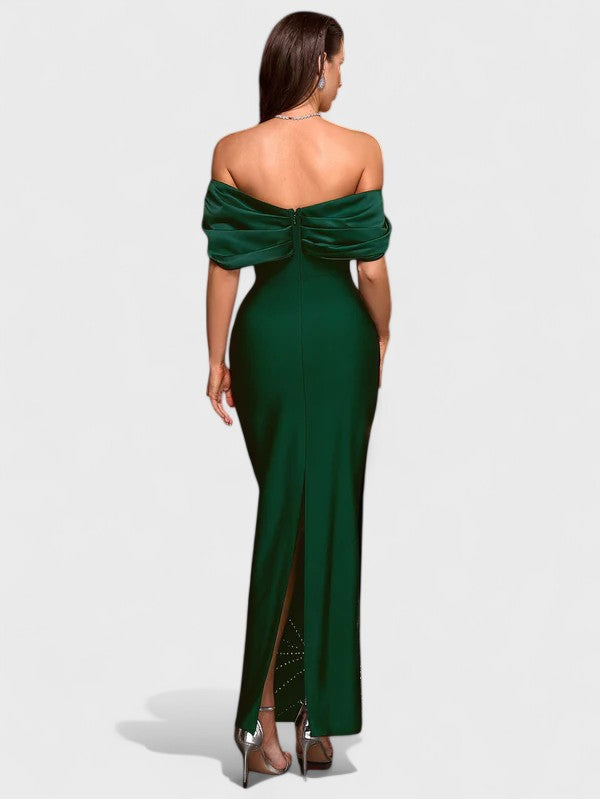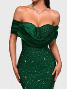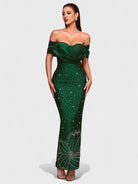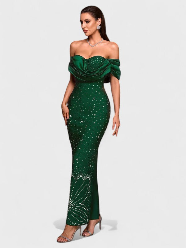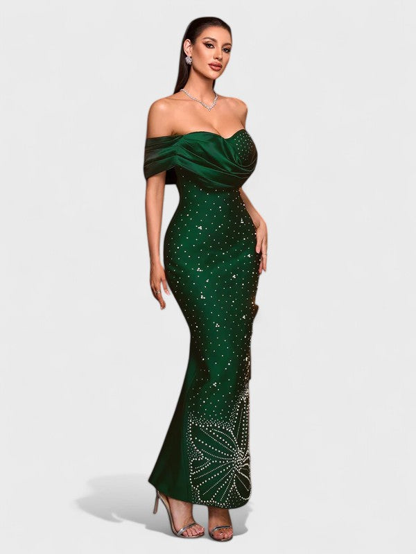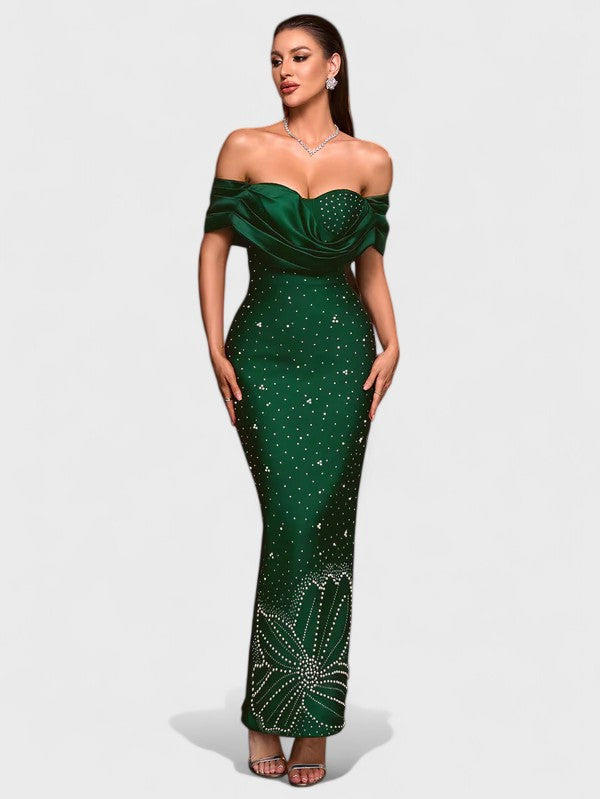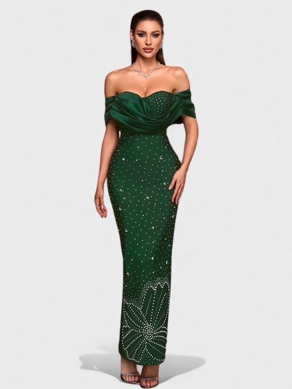 اجذب الأنظار بهذا الفستان الماكسي الرائع ذو الكتفين المكشوفين! يتميز بتطريزات متقنة من أحجار الراين لإضفاء لمسة من البريق، وتصميم ضيق يشبه الضمادة يبرز منحنياتك، هذا الفستان مثالي لإحداث تأثير قوي. سواء كان حدثًا مسائيًا فاخرًا أو مناسبة خاصة، فإن هذه القطعة اللافتة هي خيارك الأمثل للأناقة والأسلوب الفائق.