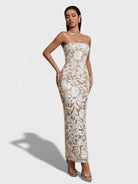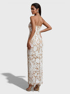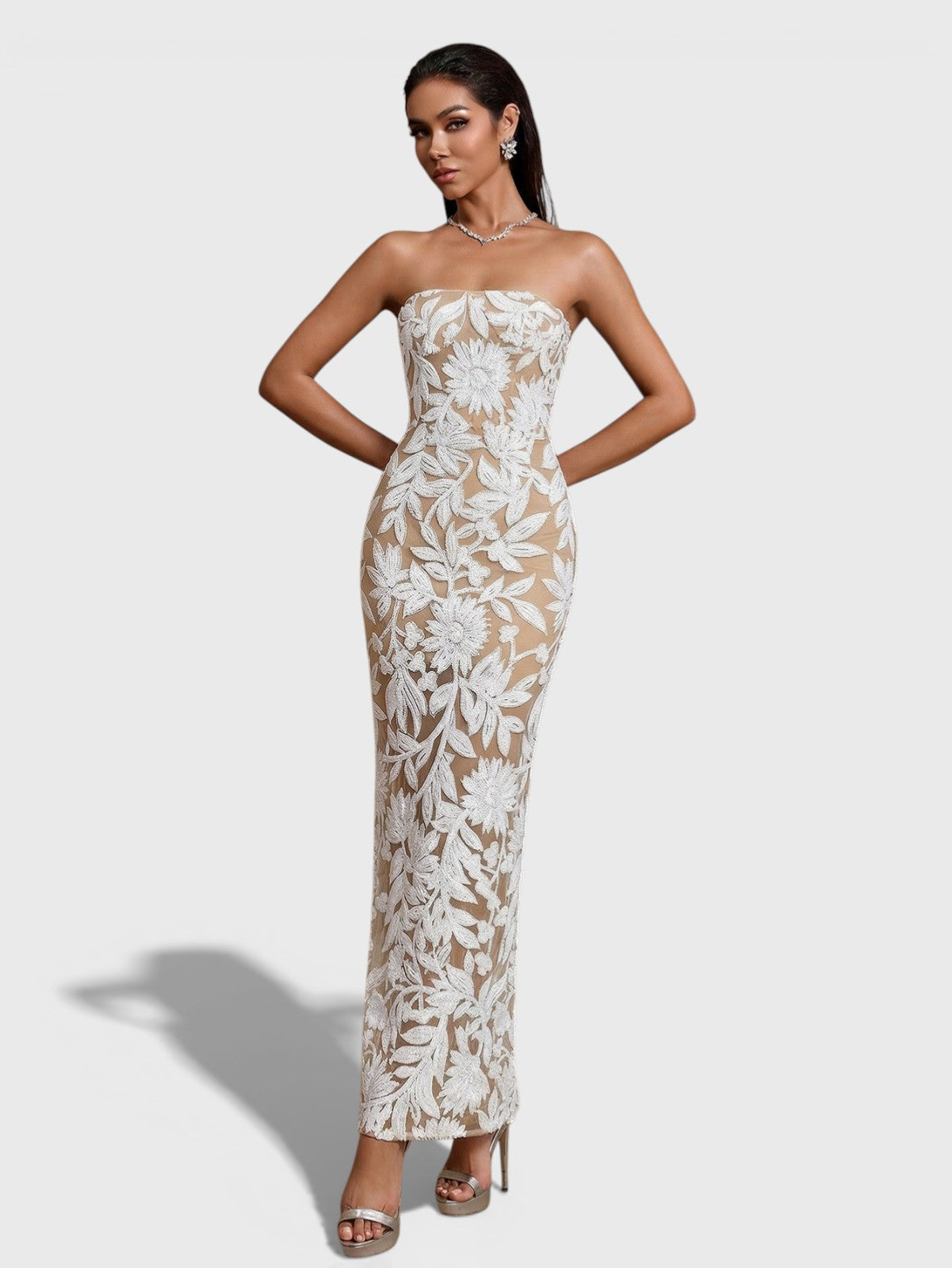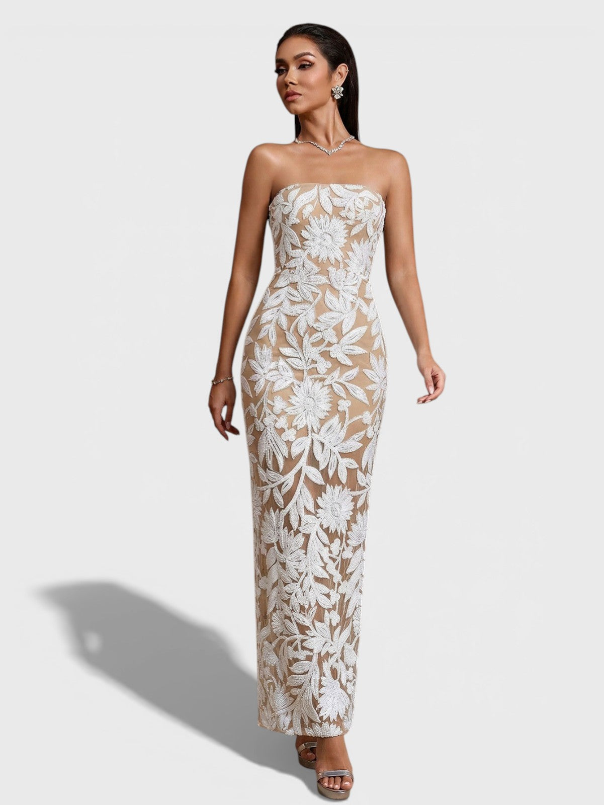 فستان لوسيين أنيق وراقي يمزج بين التصميم الكلاسيكي والتفاصيل العصرية. يتميز هذا الفستان المتوسط الطول بلون كريمي بصدرية مستوحاة من الكورسيه مزينة بزخارف دقيقة من الأحجار الكريمة تبرز الصدر والخصر والأشرطة. تضيف التنورة ذات الخط A حركة ناعمة، مما يجعله مثالياً لحفلات الحدائق، فعاليات الزفاف، أو الاحتفالات الخاصة.