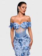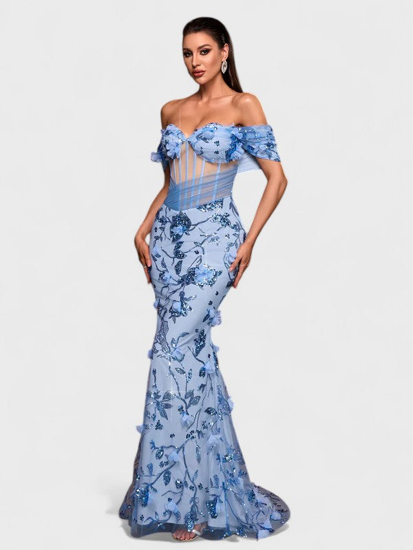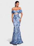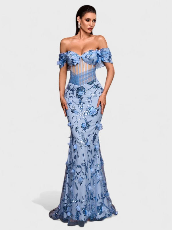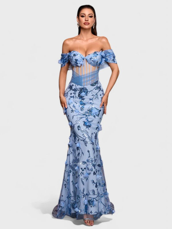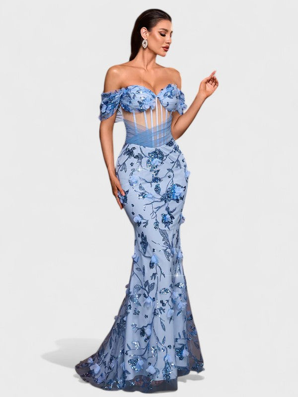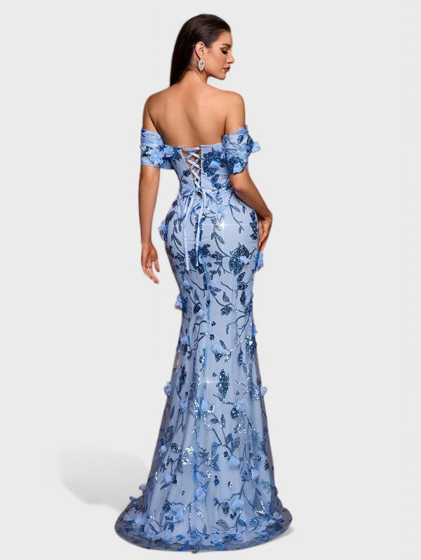 A masterpiece of romance and allure. Crafted in soft light blue mesh adorned with intricate floral appliqué and shimmering sequins, it captures the essence of ethereal elegance. The off-shoulder neckline and structured corset bodice flatter the silhouette, while the lace-up back ensures a perfect fit. Finished with a graceful mermaid hem, this gown brings effortless sophistication to evening occasions, galas, and formal events.