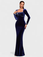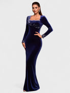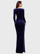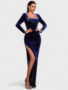 Soraya Long Sleeve Velvet Pearl High Slit Blue Maxi Dress