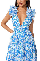 يتميز بطبعة زهور زرقاء جذابة على قاعدة بيضاء نقية، هذا القطعة المميزة تنضح بالأناقة والرومانسية. يخلق خط العنق العميق، والصدرية المنظمة، والكتفين المزخرفين بالكشكشة مظهراً جذاباً، بينما تضيف الظهر المفتوح مع تفاصيل الربط لمسة مثيرة. مُنتهٍ بكشكش متساقط على التنورة لإضافة حركة، هذا الفستان مثالي لحفلات الحدائق، حفلات الزفاف، أو عطلتك القادمة.