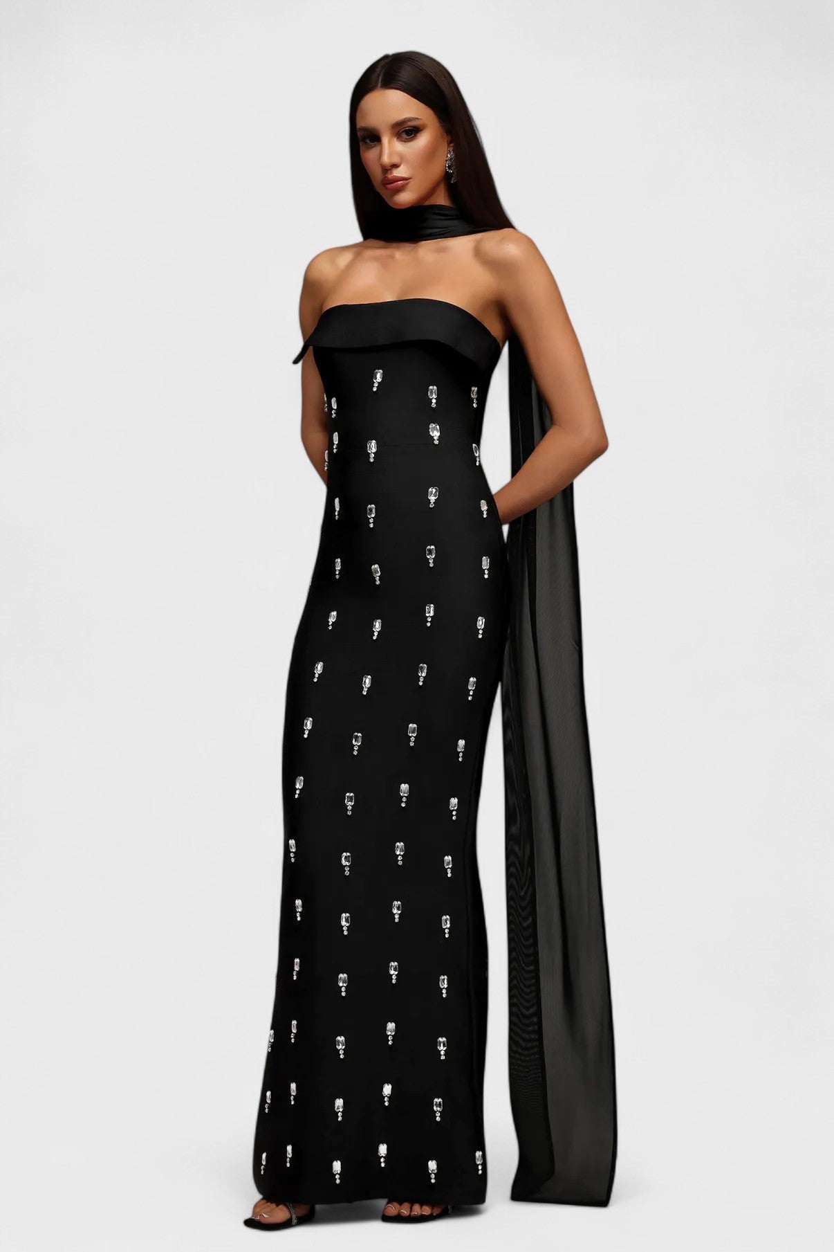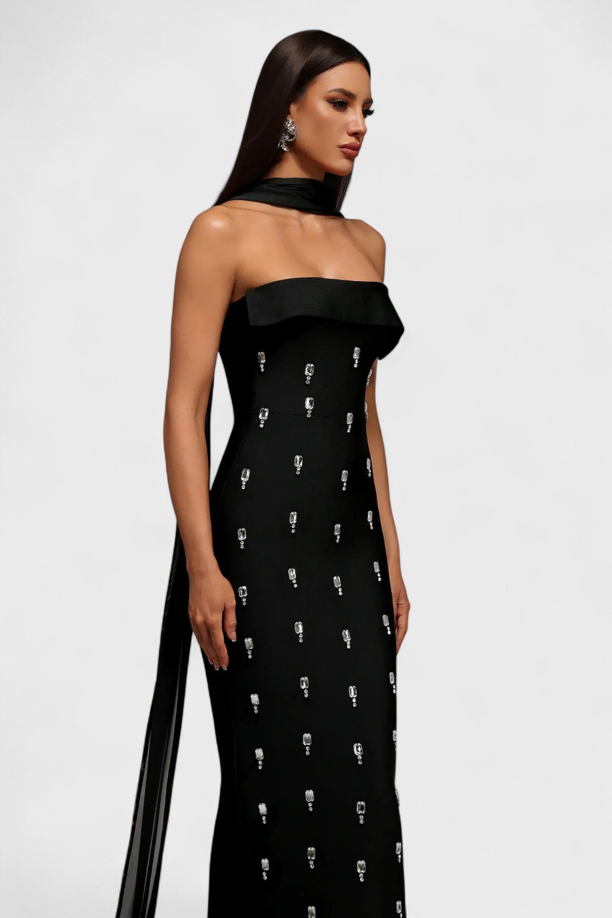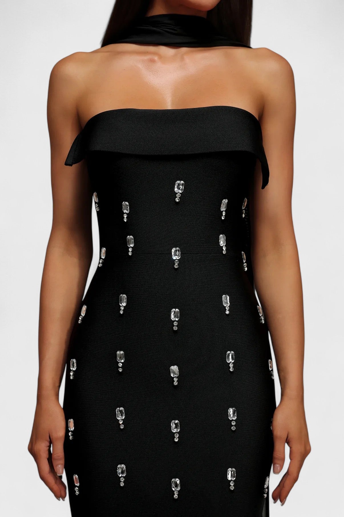 The Freyde Dress is designed to captivate with its sleek silhouette and sparkling embellishments. Crafted from body-contouring bandage fabric, it features a strapless neckline with a folded edge, while crystal diamond appliqués are scattered across the dress for a refined yet glamorous effect. A flowing back drape making this dress a show-stopping choice for evening galas.