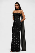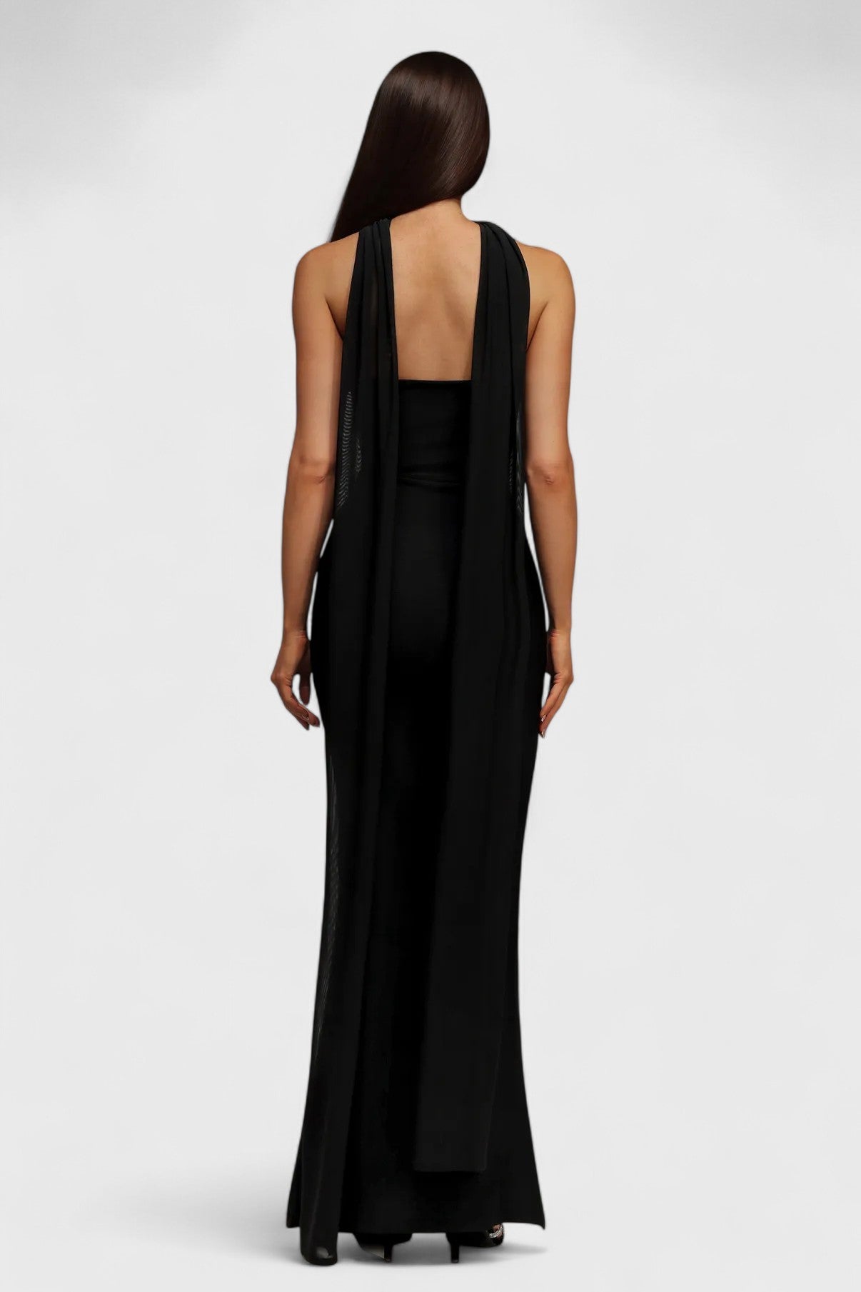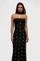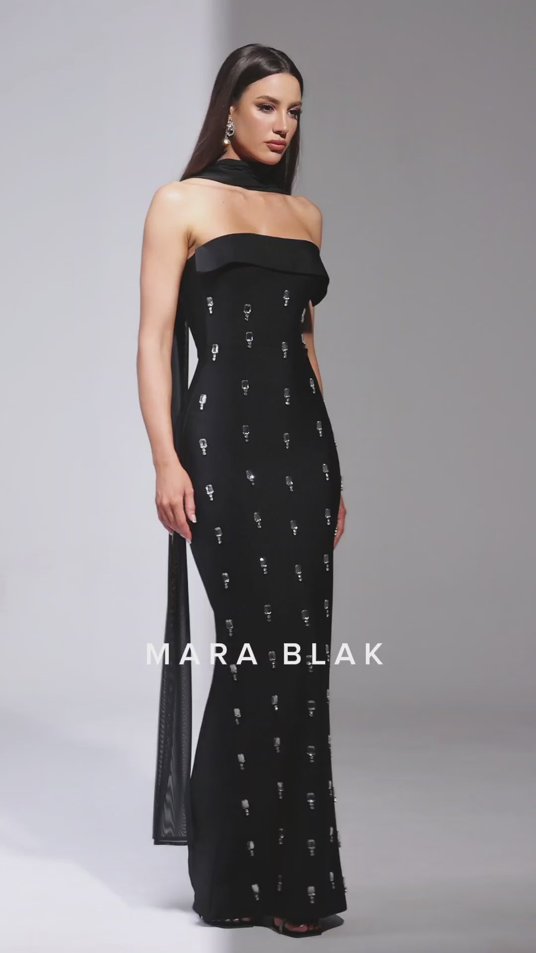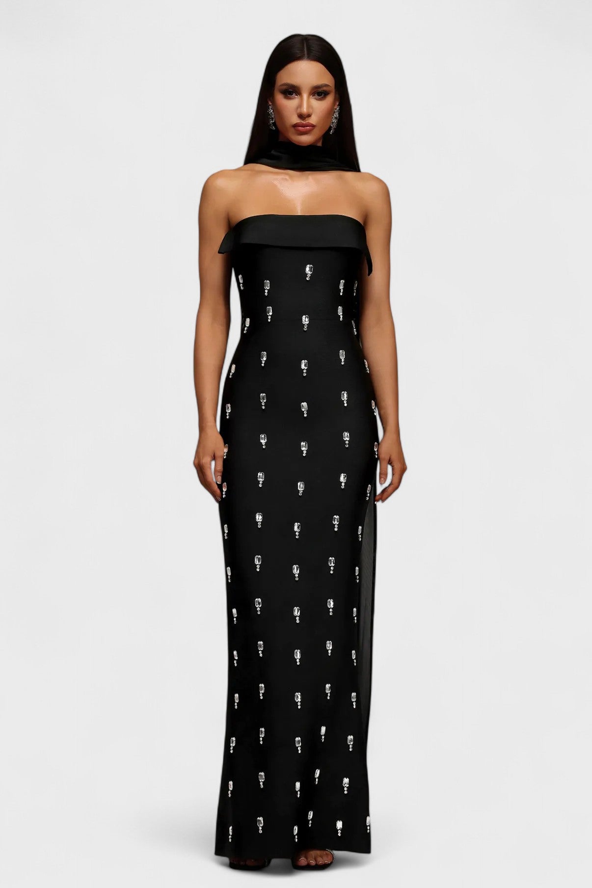 The Freyde Dress is designed to captivate with its sleek silhouette and sparkling embellishments. Crafted from body-contouring bandage fabric, it features a strapless neckline with a folded edge, while crystal diamond appliqués are scattered across the dress for a refined yet glamorous effect. A flowing back drape making this dress a show-stopping choice for evening galas.