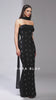 - Design/Features: Strapless neckline with folded detail, scattered diamond crystal appliqués, slim-fit silhouette, dramatic long draped panels at the back