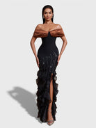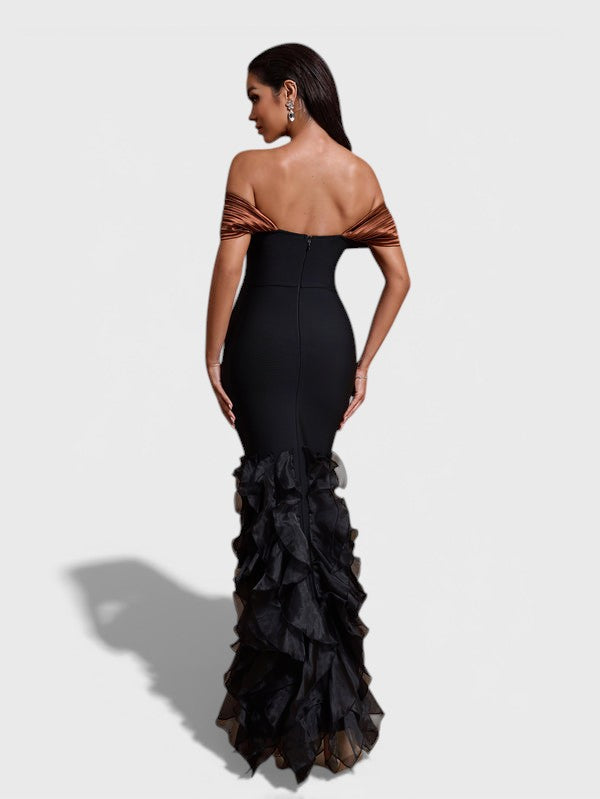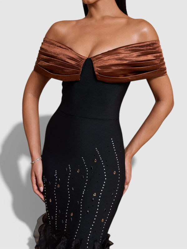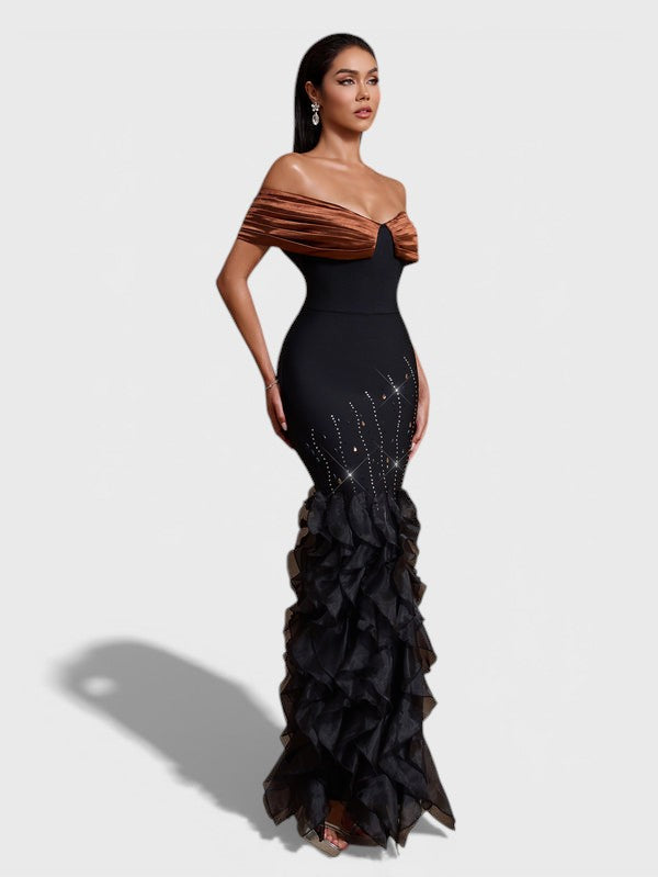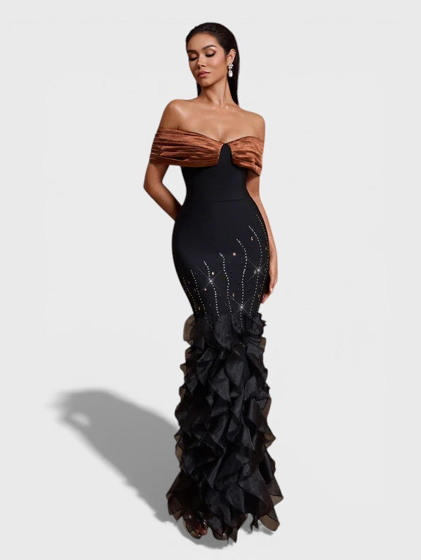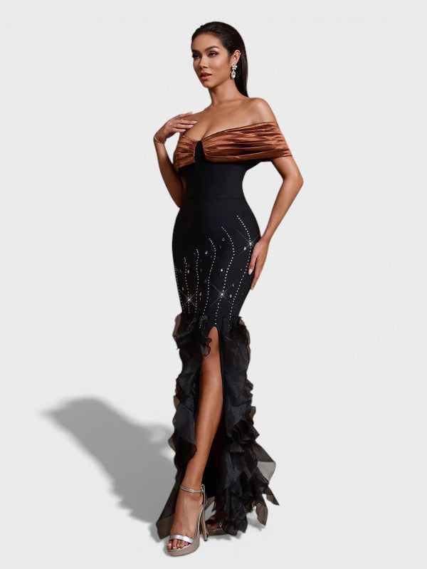 Heloisa Off-Shoulder Crystal Bandage Ruffle Hem Maxi Dress