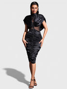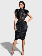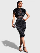 Featuring a high neckline with soft draped detailing, the dress highlights the waist with sheer illusion paneling for a modern, sculpted look. The ruched skirt enhances curves beautifully, while the sleek midi length adds timeless refinement. Perfect for cocktail events, evening dinners, and upscale occasions.