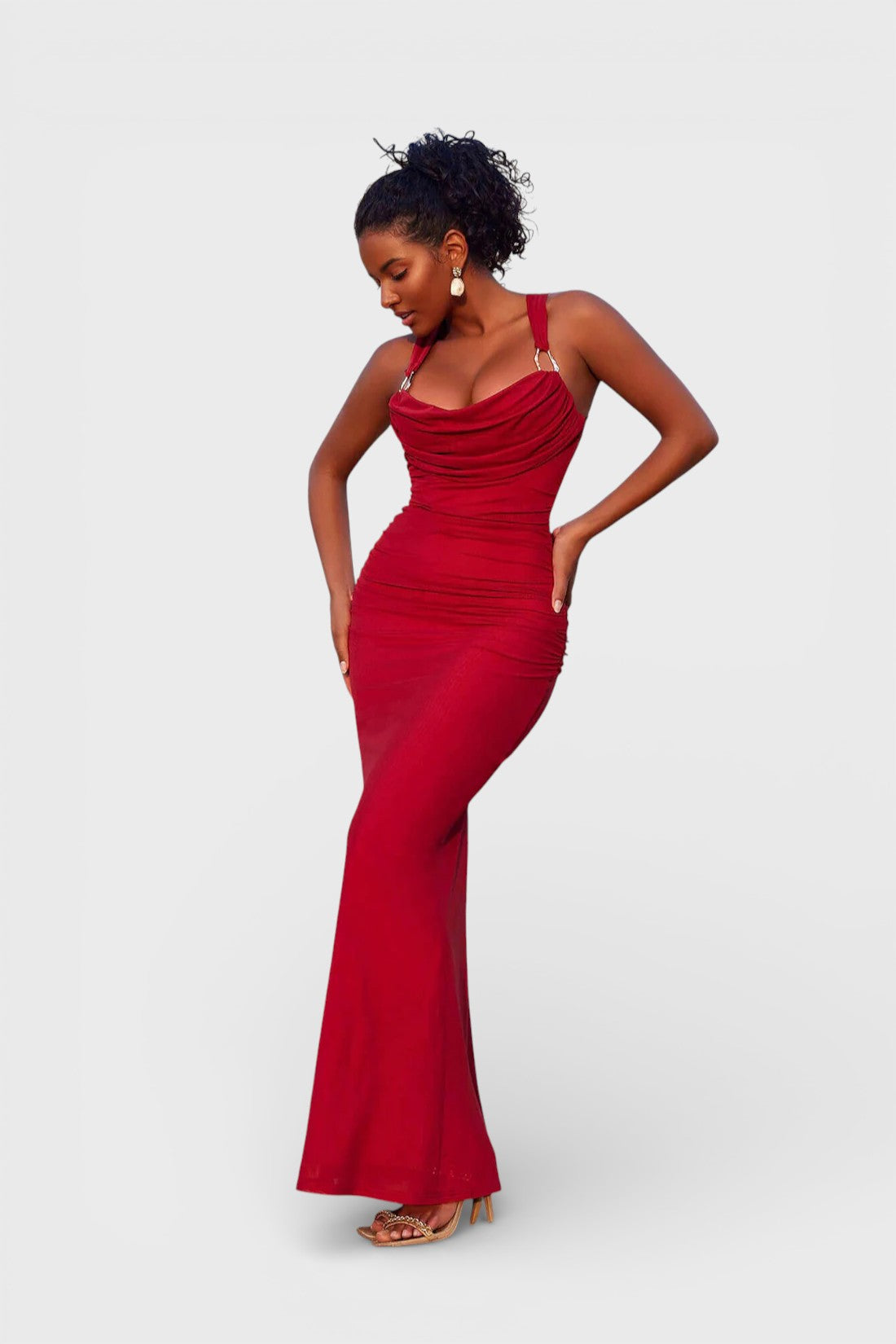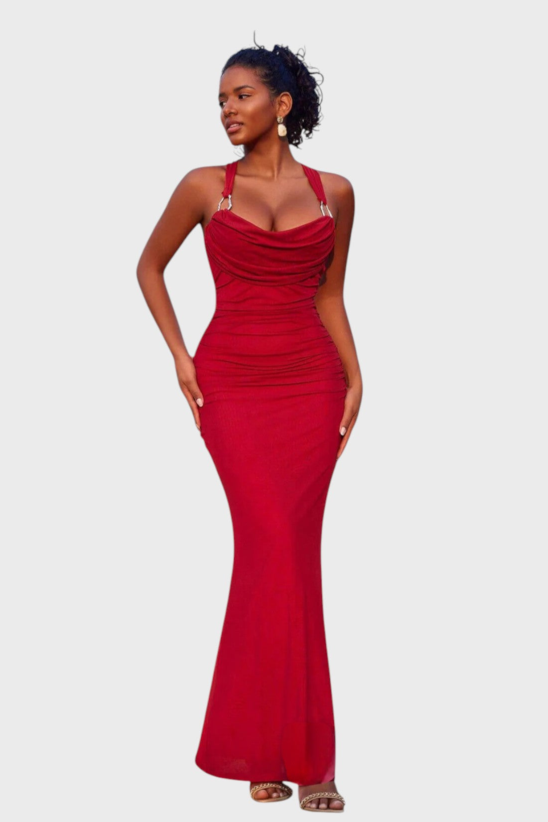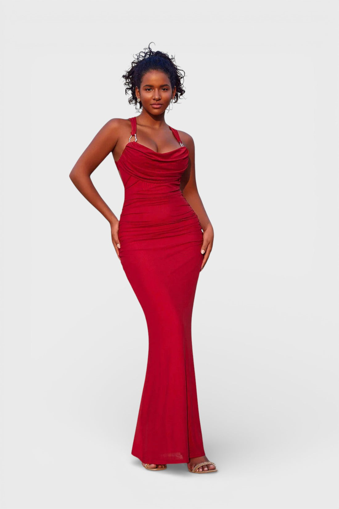 - Design / Features: Draped cowl neckline, sleeveless design, ruched body detailing, open back with criss-cross straps, floor-length hem, body-contouring silhouette