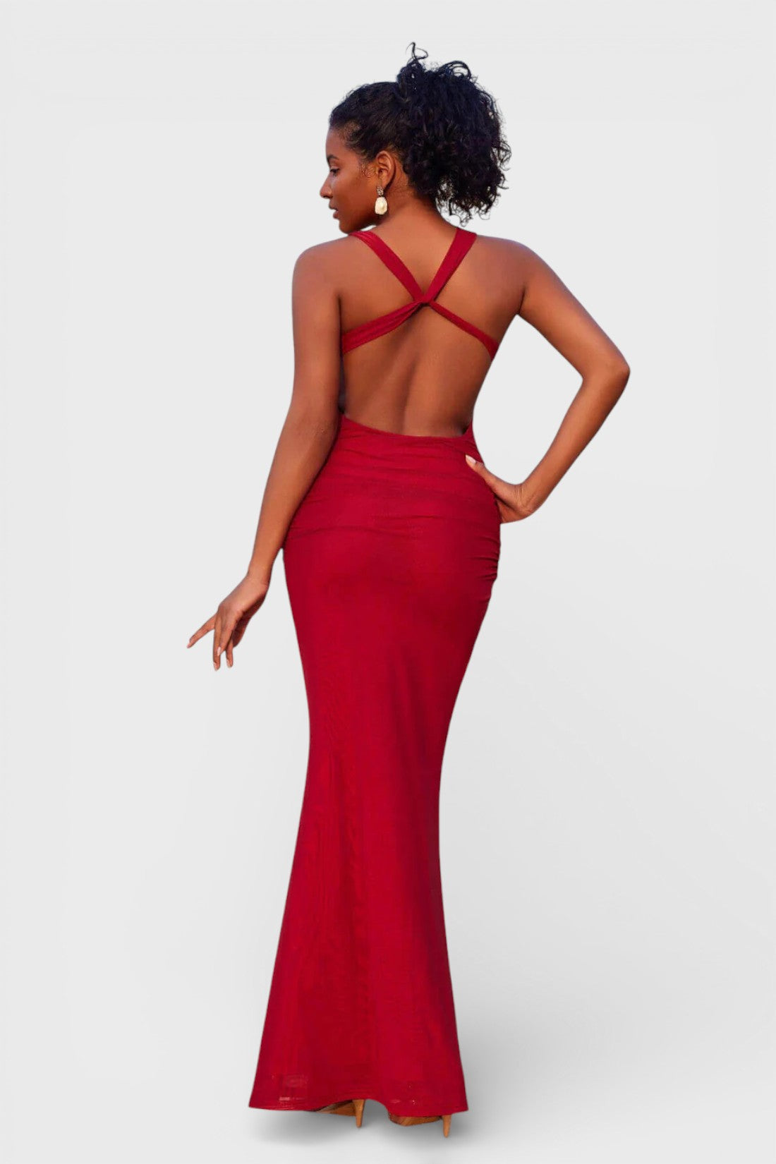 The sultry red maxi dress is designed to sculpt and flatter from every angle. Featuring a softly draped neckline and a body-hugging silhouette, this gown flows effortlessly to the floor while showcasing a striking open back with criss-cross straps.