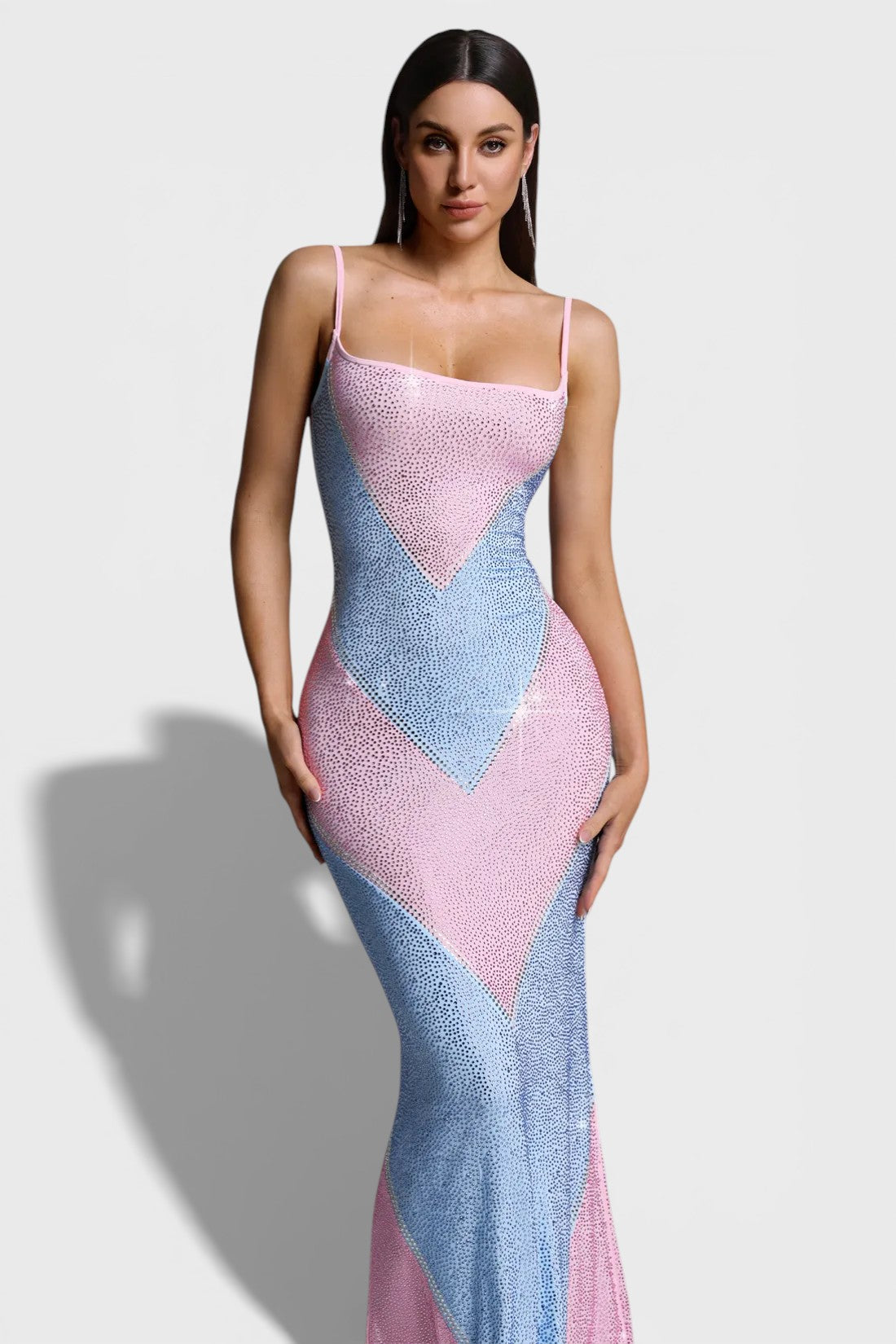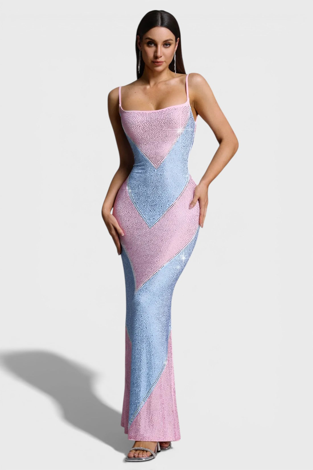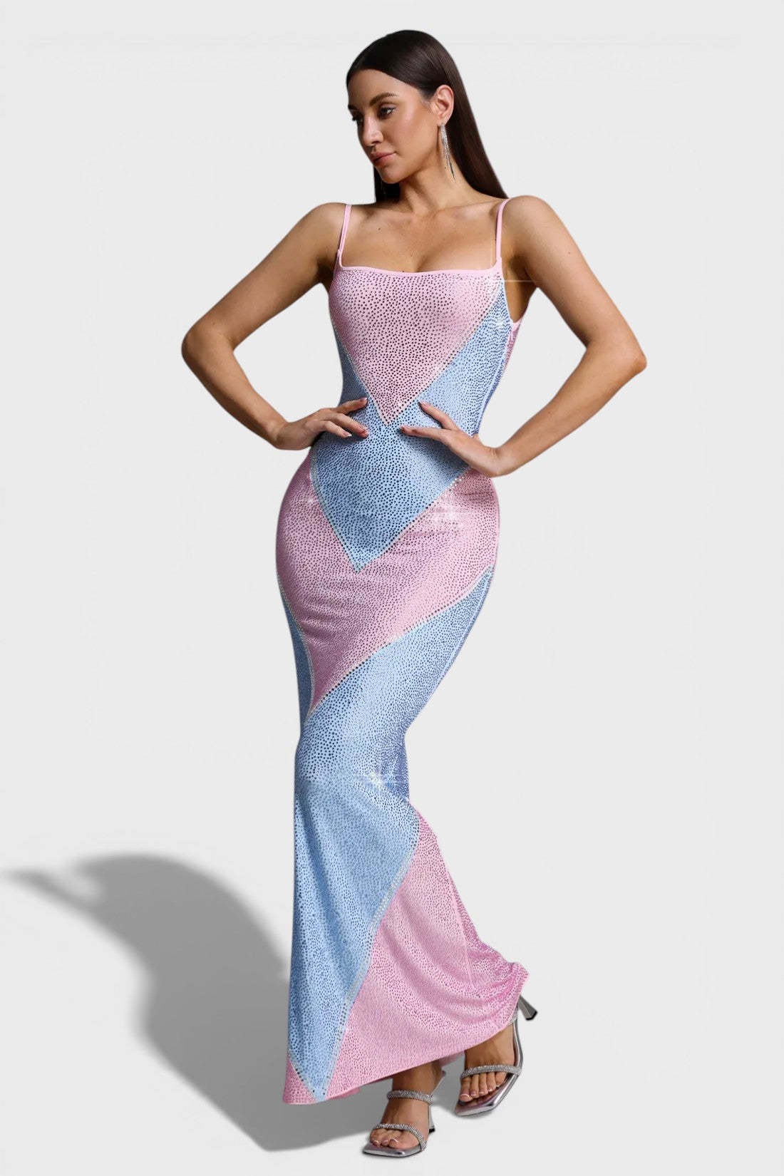 The eye-catching geometric colorblock design is fully adorned with shimmering crystal embellishments, creating a luminous effect from every angle. Delicate spaghetti straps and a softly curved neckline add a feminine touch, while the maxi length elongates the figure for an effortlessly elegant finish.