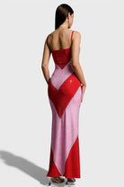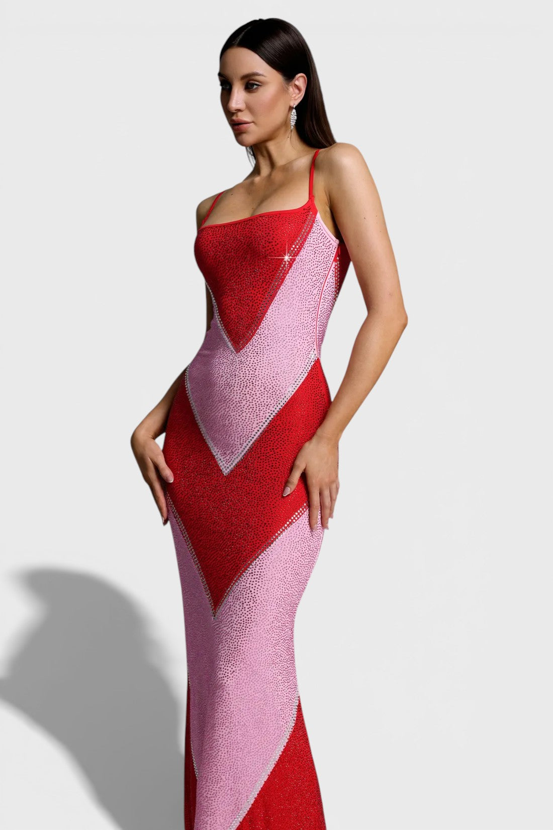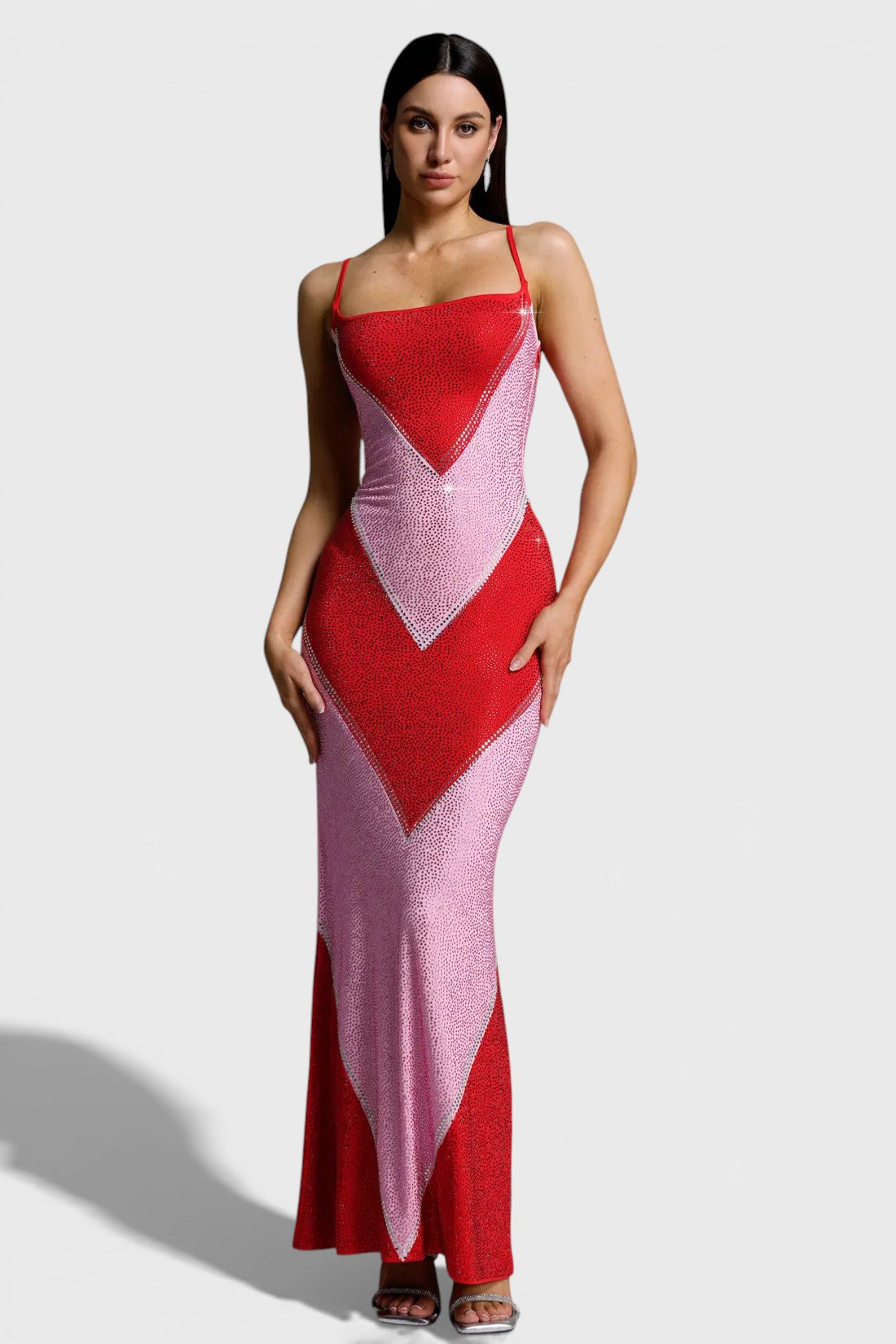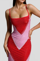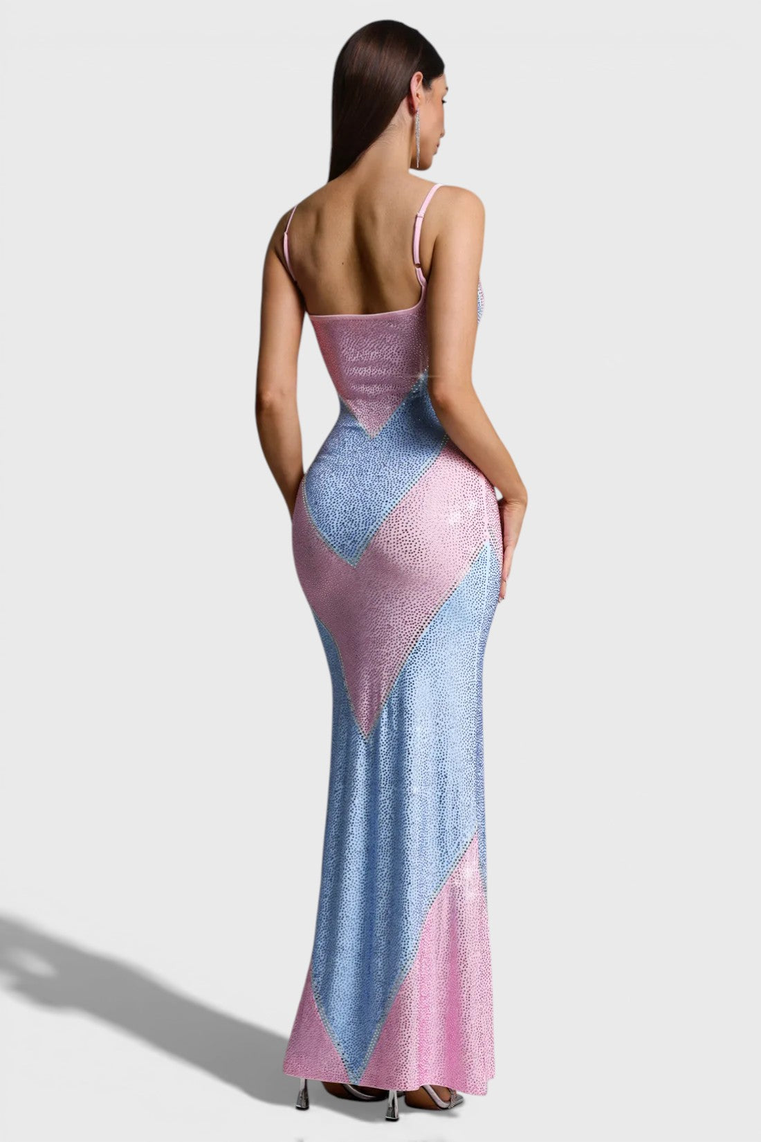 The eye-catching geometric colorblock design is fully adorned with shimmering crystal embellishments, creating a luminous effect from every angle. Delicate spaghetti straps and a softly curved neckline add a feminine touch, while the maxi length elongates the figure for an effortlessly elegant finish.