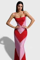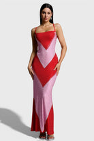 Make a bold, radiant statement with the Mariya Crystal Colorblock Bodycon Maxi Dress. Designed to contour and enhance your silhouette, this striking piece features a sleek, figure-hugging fit crafted from stretch fabric.
