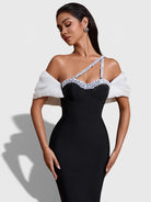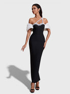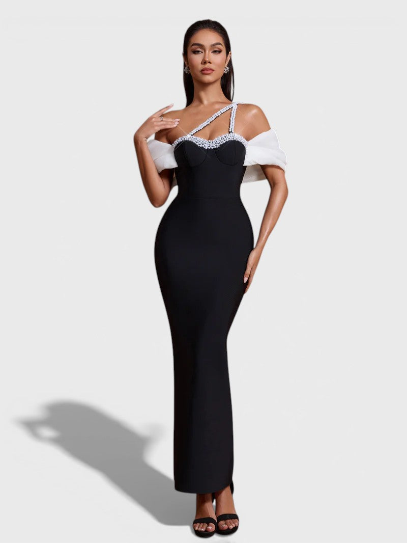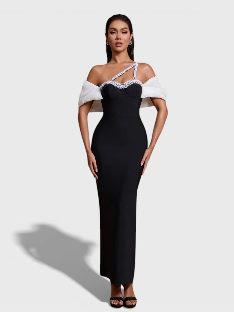 Refined elegance meets modern allure in the Maysa Off-Shoulder Crystal Strap Bandage Dress, crafted from premium bandage fabric for a smooth, contouring fit. The structured bustier-style bodice is accented with delicate crystal trim, while asymmetrical crystal straps add a contemporary, eye-catching detail. Soft off-shoulder white draped sleeves create a contrast against the sleek black silhouette. Finished with a sleek maxi-length cut and a subtle back slit.