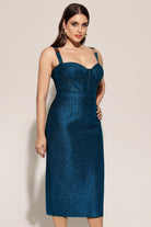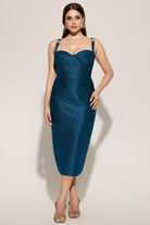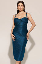 The Aura Metallic Bandage Midi Dress is a sleek, curve-enhancing piece designed to shine at any evening occasion. Crafted from shimmering metallic bandage fabric, it features a sculpted bustier-style bodice with structured cups and wide straps detailed with statement gold-tone buckle hardware. The bodycon silhouette hugs the figure, finishing at a chic midi length, making it the perfect blend of elegance and bold, modern style.