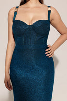 - Design/Features: Bustier-style bodice with structured cups, wide straps with gold-tone buckle details, curve-hugging fit, shimmering metallic fabric