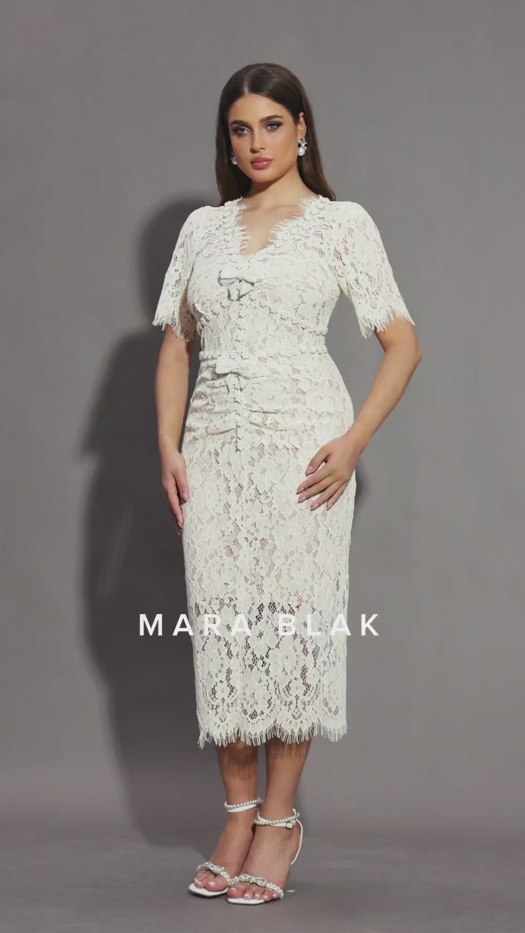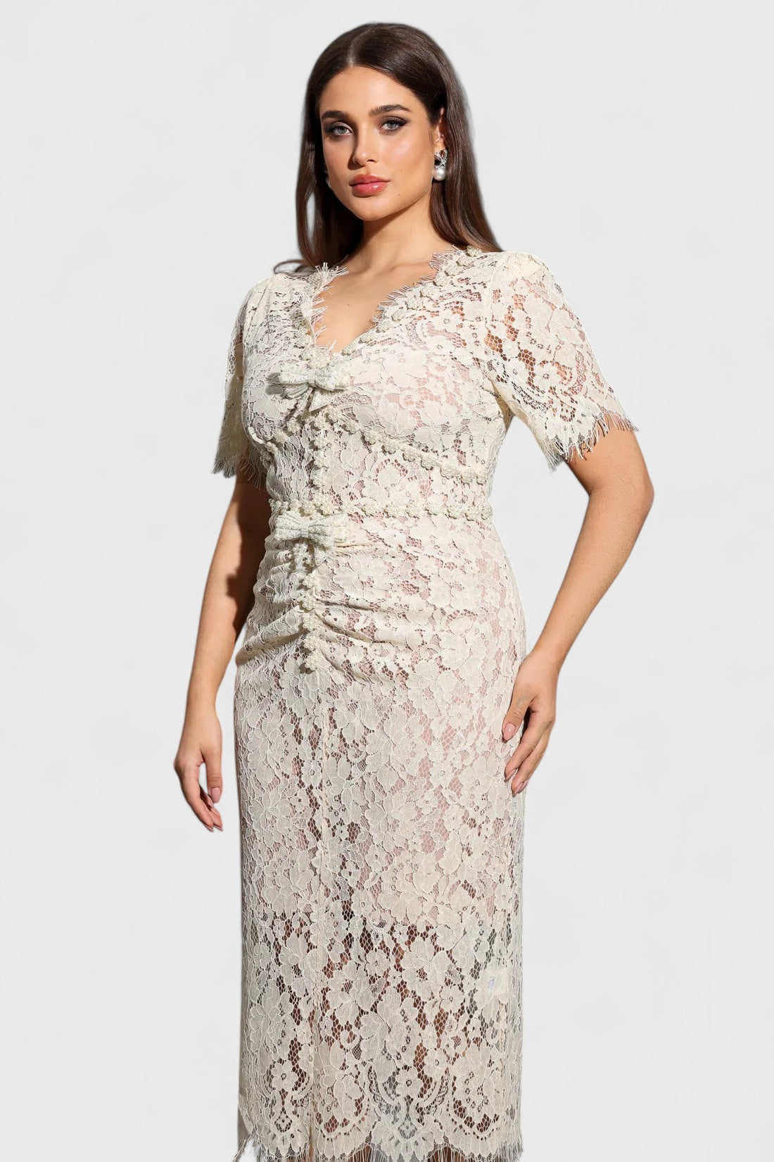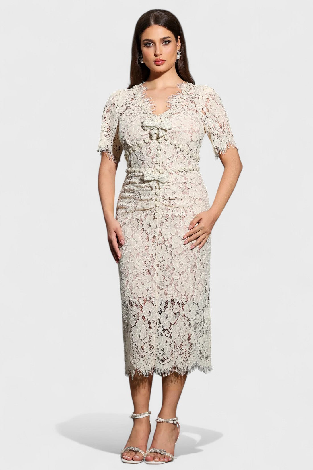 Timelessly romantic and intricately designed, the Élodie Midi Dress showcases vintage-inspired lace with delicate pearl-embellished bow accents. A sculpted silhouette, ruched waist, and scalloped hemline complete this refined and feminine look — perfect for formal occasions, receptions, or elevated daywear.