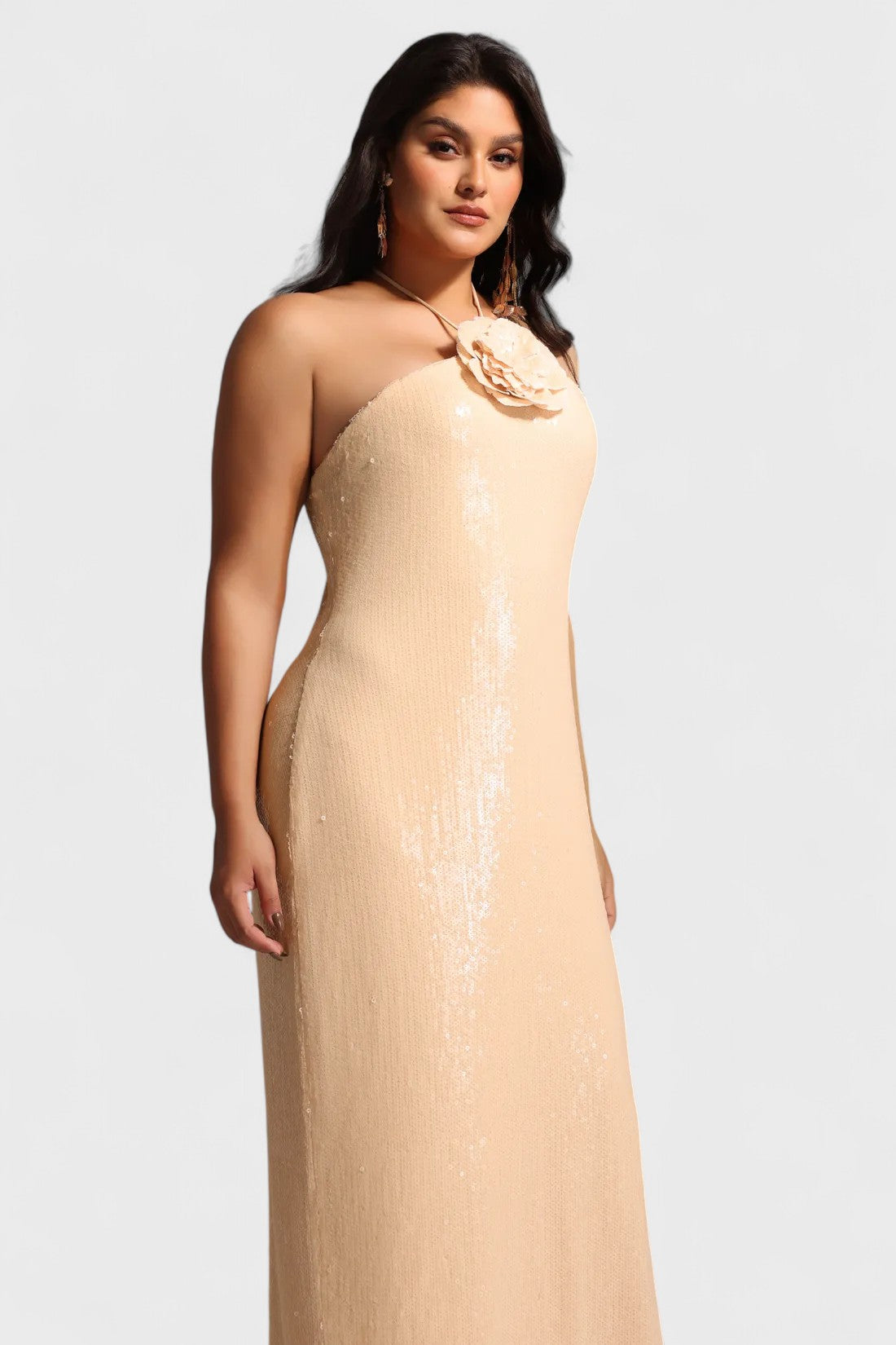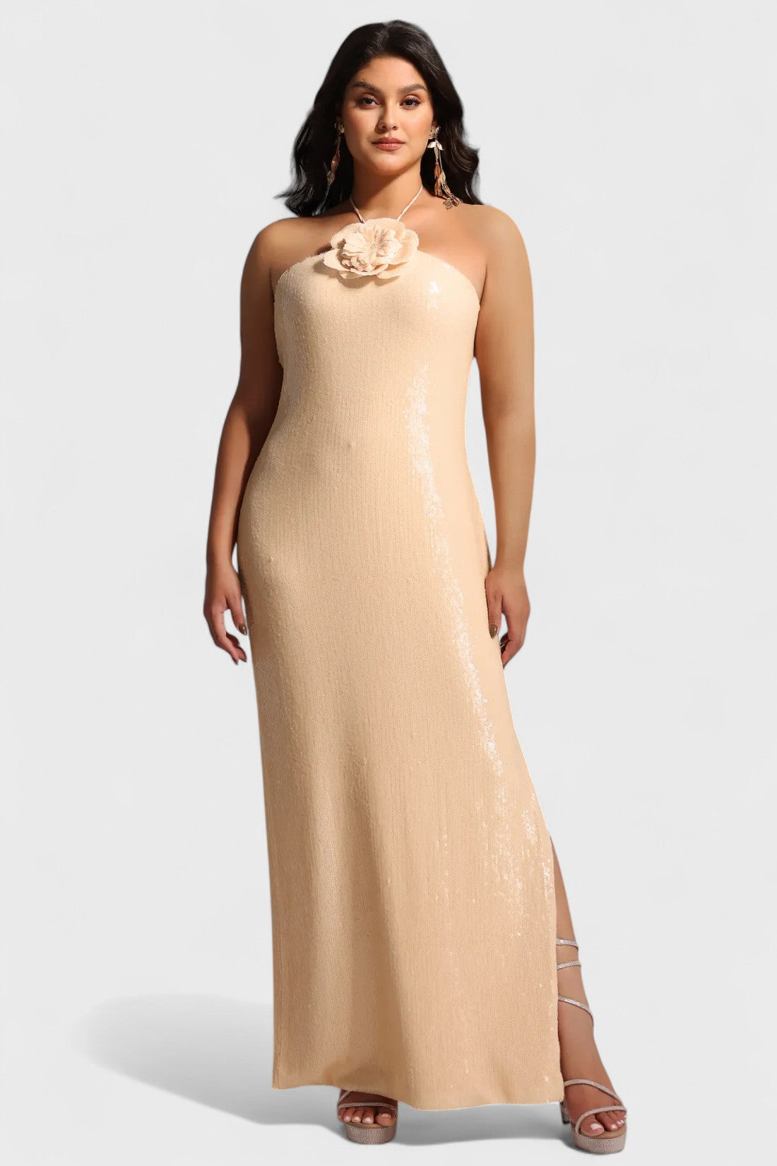 Plus Loretta 3D Floral Applique Halter Sequin Maxi Dress