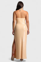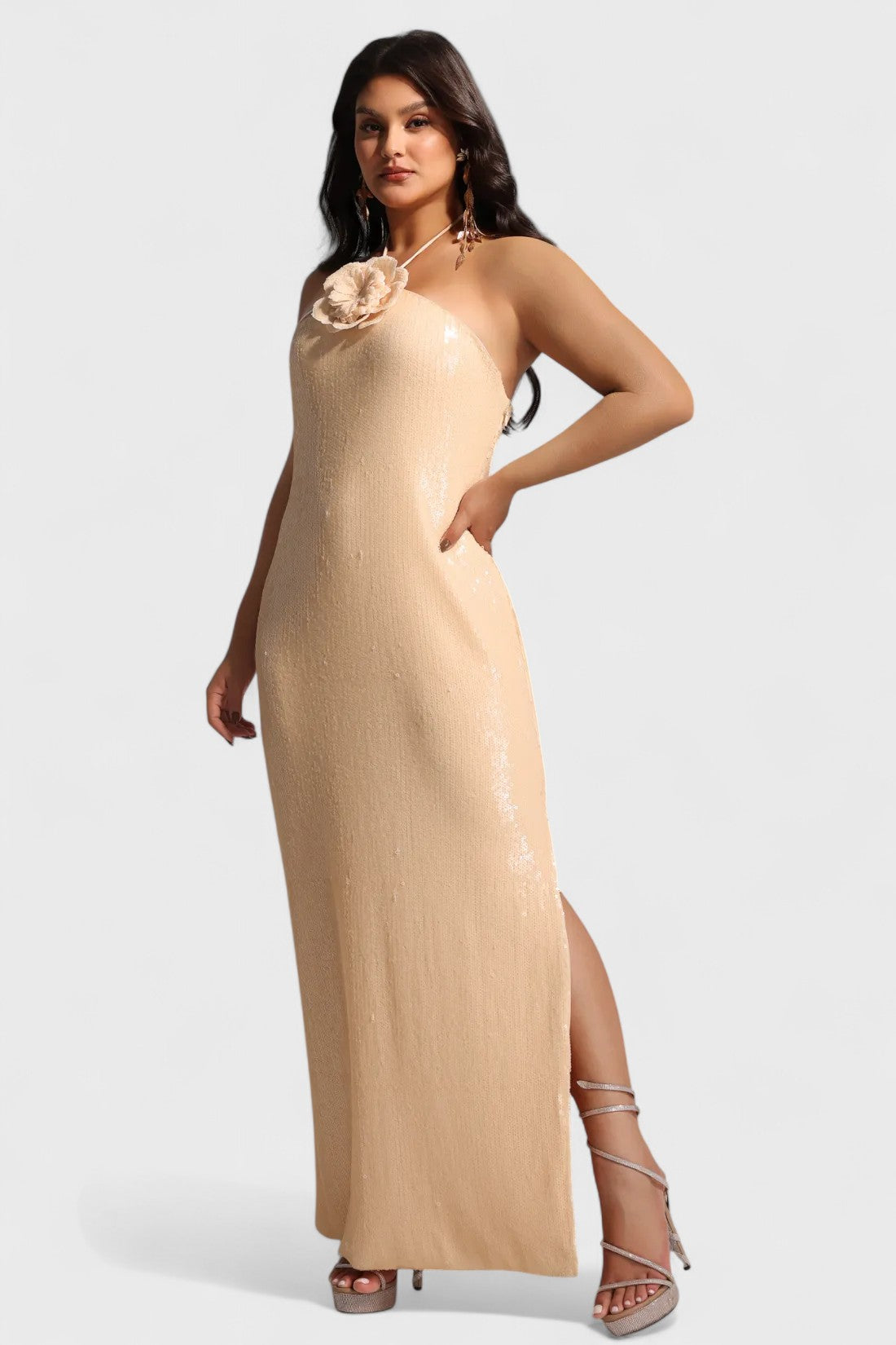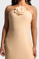 The Loretta Dress is the ultimate showstopper, blending timeless elegance with modern glamour. Crafted from sequin-embellished fabric, this maxi dress is designed with a strapless silhouette and halter tie for support, finished with a statement 3D floral applique at the neckline. A side slit adds movement and allure, making it the perfect gown for evening occasions, galas, and formal events.