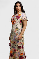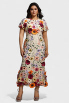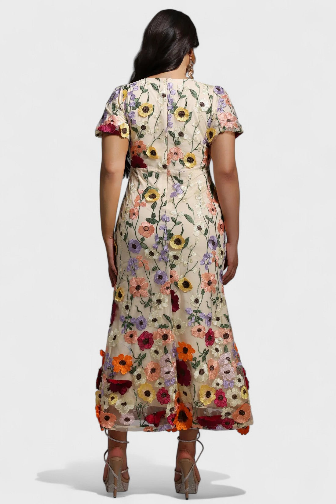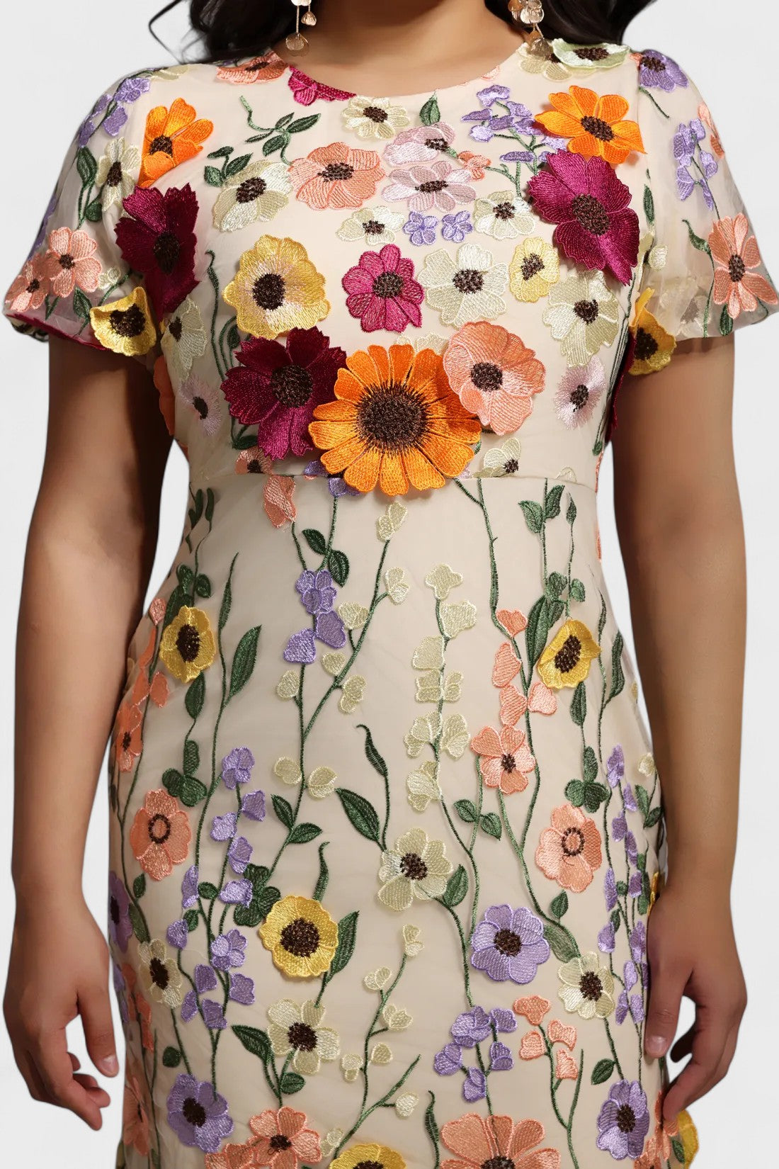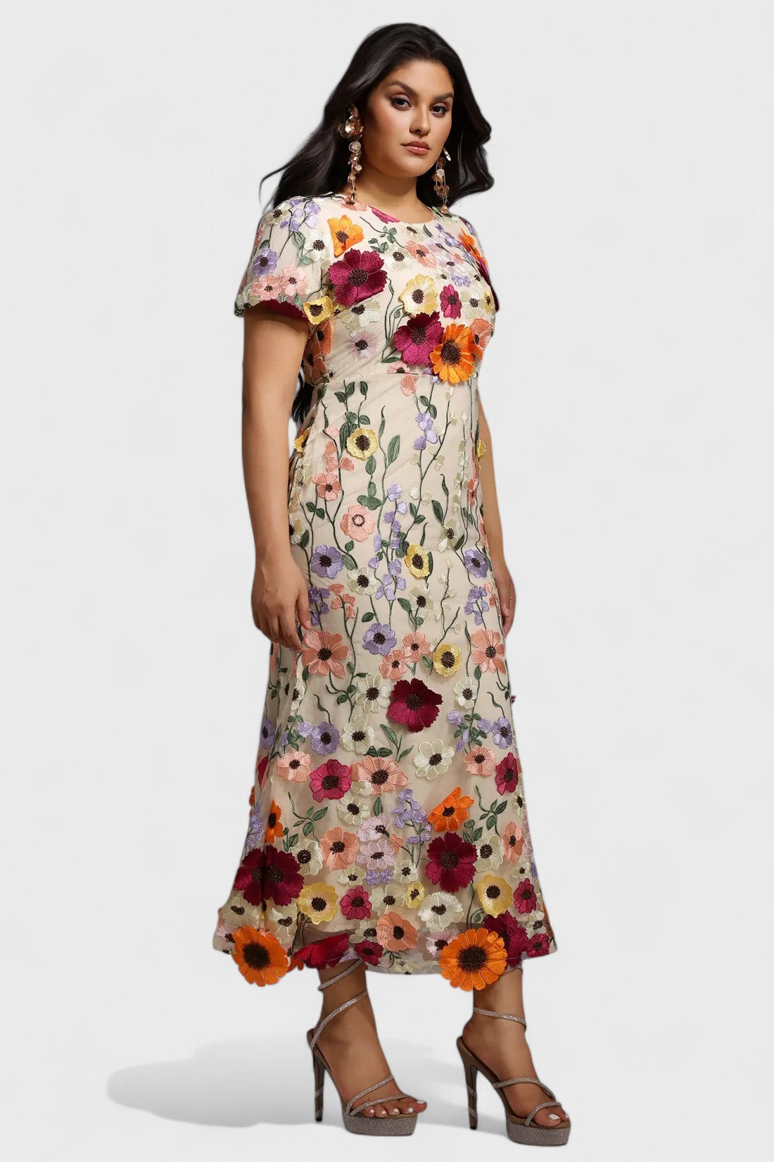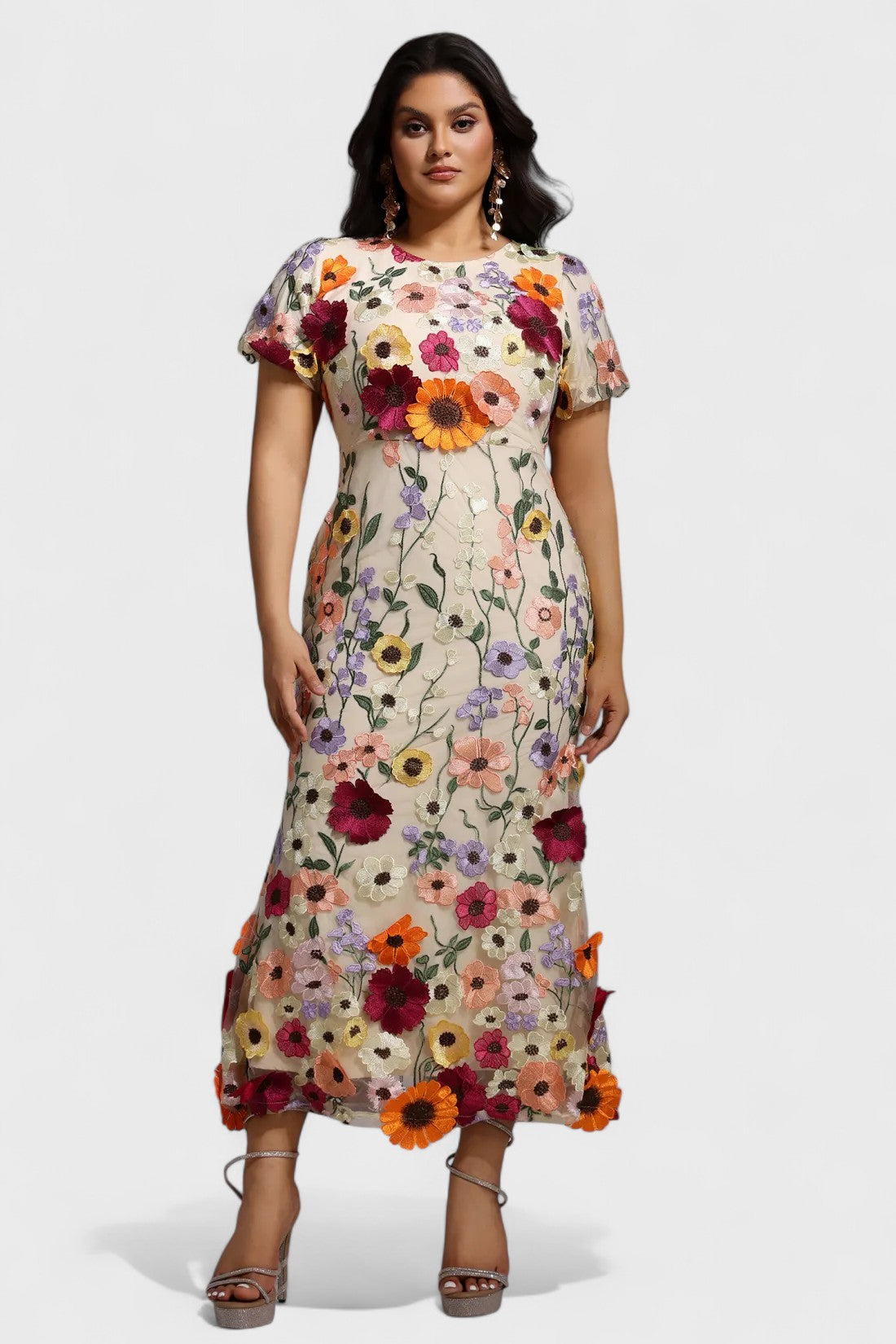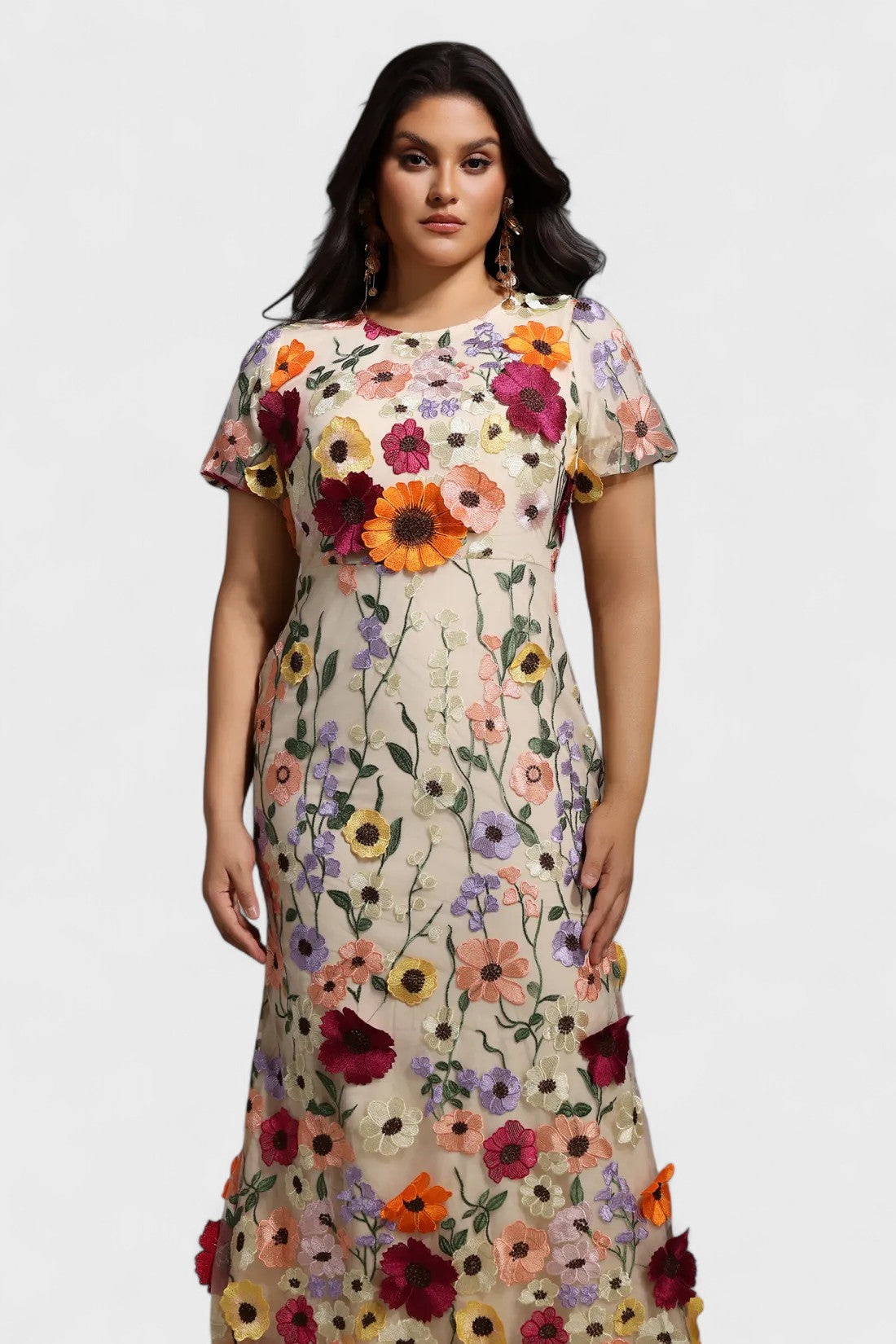 The Plus Mari Short Sleeve Embroidery Floral Maxi Dress is a stunning, feminine piece featuring a nude base adorned with vibrant 3D floral embroidery in red, yellow, purple, and orange shades. The round neckline and short, puffed sleeves add a soft and romantic touch, while the fitted silhouette gently flares into a fishtail hem, creating an elegant, flowy effect. Perfect for garden parties, weddings, or any special occasion, this dress combines timeless elegance with modern floral detailing for an effortlessly chic look.