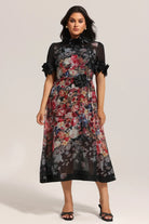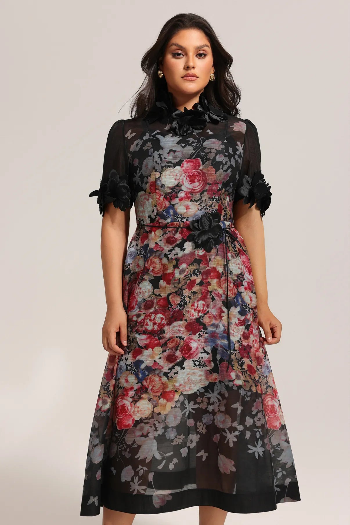 The enchanting floral print of the Mariela Midi Dress makes it an instant statement. Designed with sheer short sleeves adorned with delicate 3D appliqué flowers and a refined high neckline, it creates a feminine, timeless silhouette. The flowing A-line skirt drapes gracefully, while the detachable waist belt cinches at the waist for a flattering shape. Perfect for weddings, garden parties, or special occasions, this piece is elegance reimagined.
