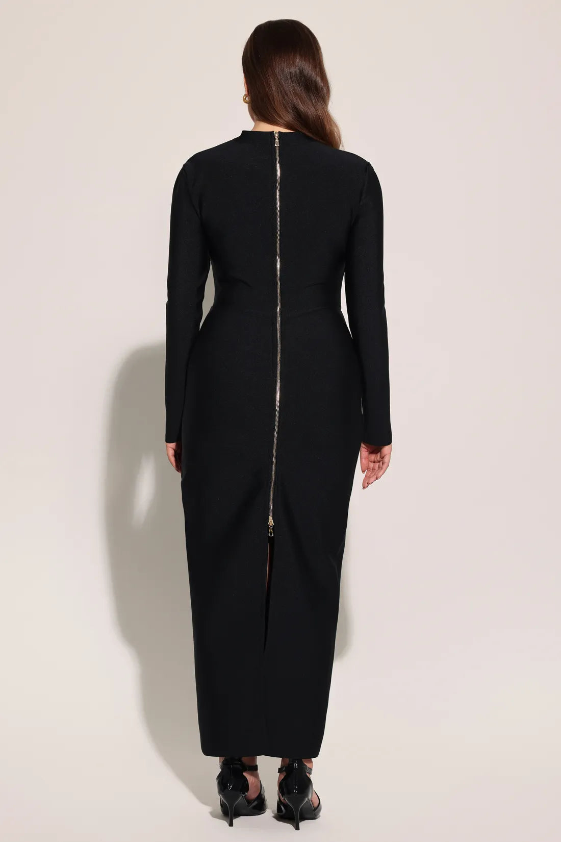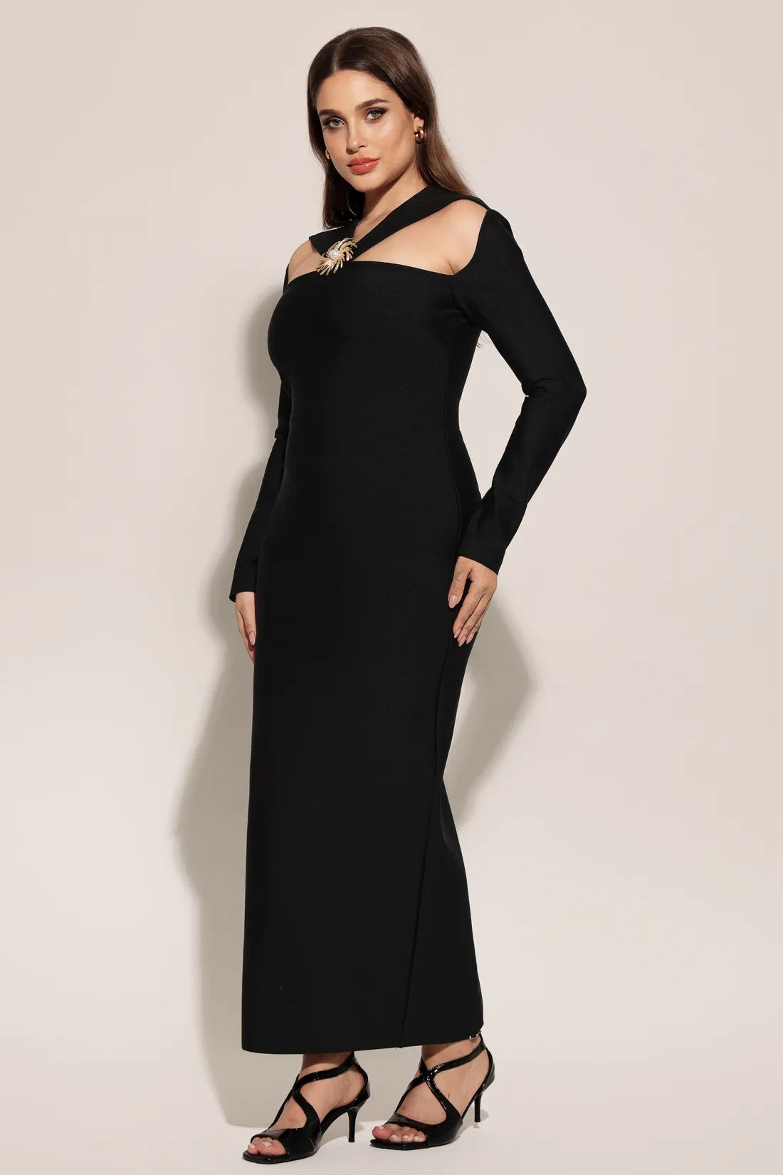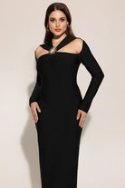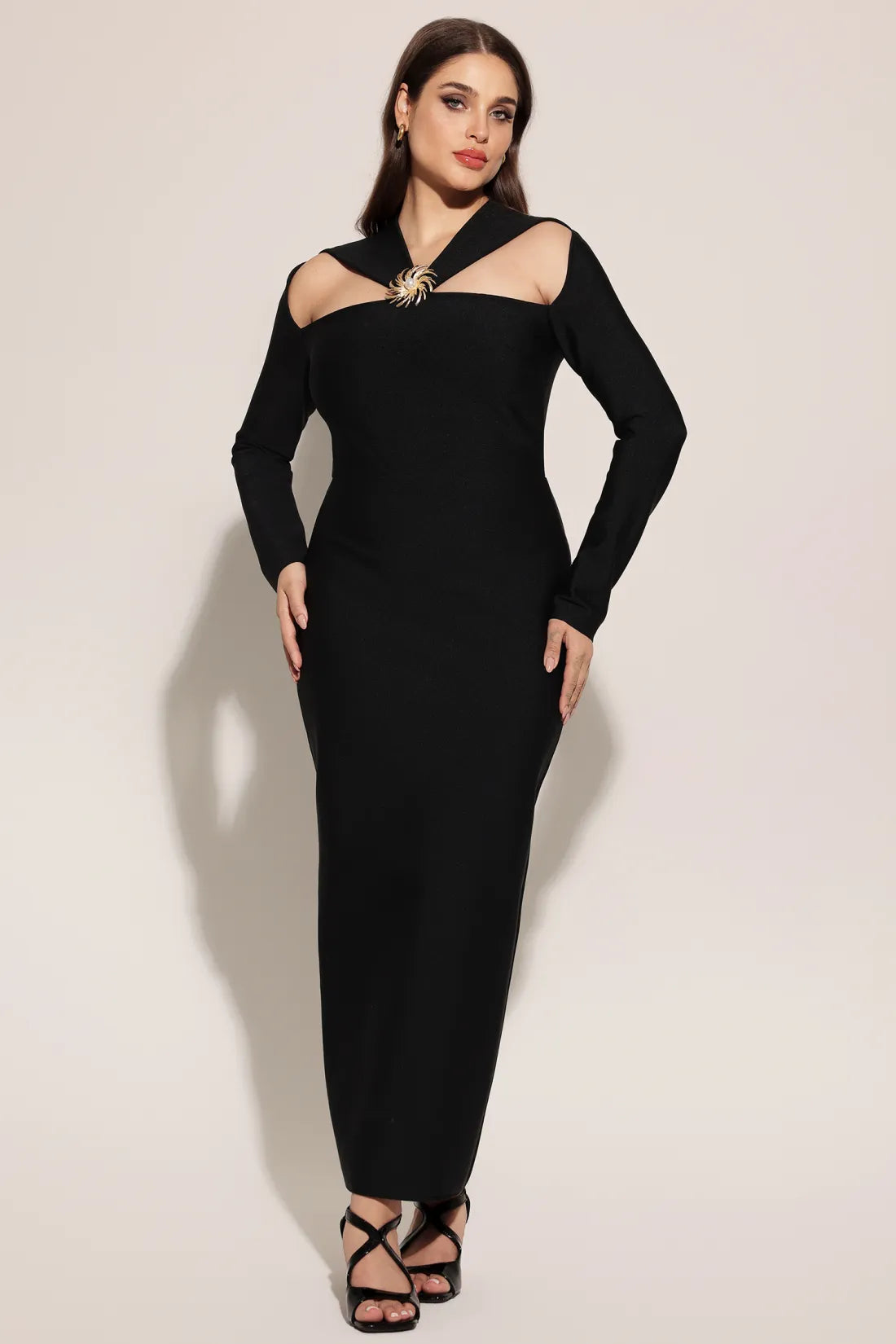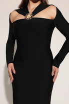 The Aurelia Dress — a sophisticated statement piece that combines timeless elegance with modern edge. Crafted from premium stretch bandage fabric, this off-shoulder silhouette features a bold cut-out neckline accented by a striking gold sunburst embellishment. The long sleeves, body-contouring fit, and back vent create a sleek and confident look that transitions effortlessly from evening soirées to formal occasions.