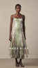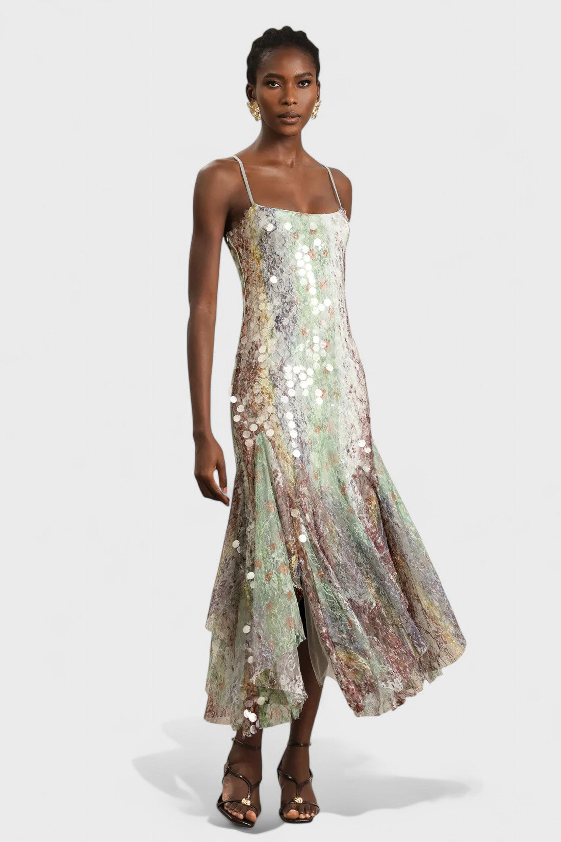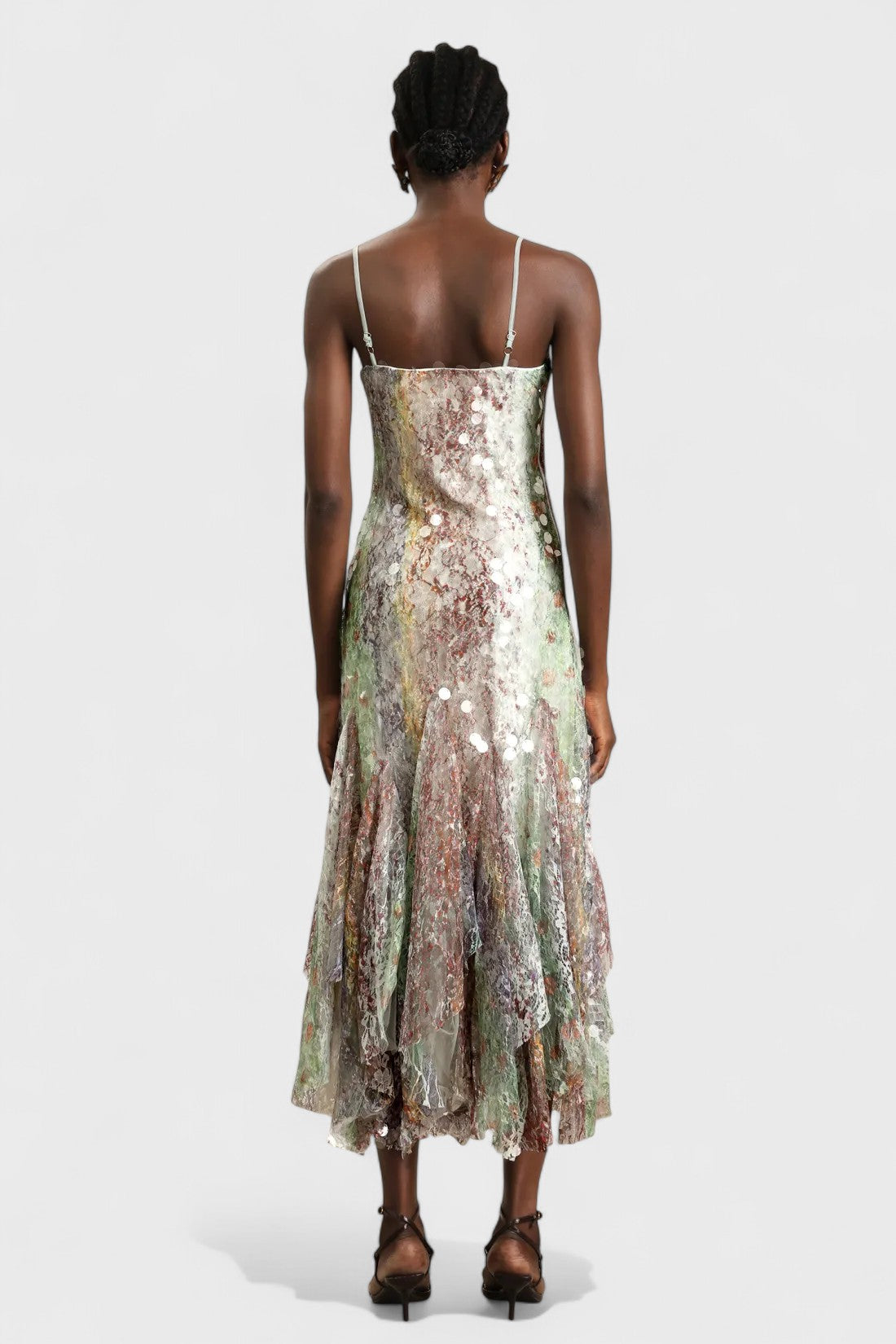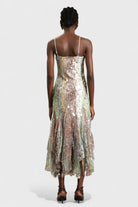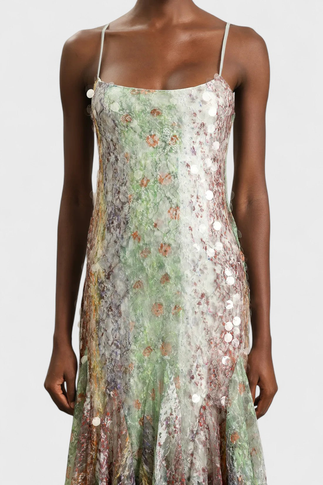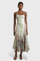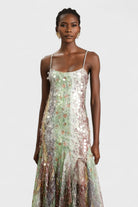 Dreamy and ethereal, the Saskia Dress shimmers with soft light reflections and an artful blend of pastel tones. Designed with delicate lace layered under scattered sequins, this fluid maxi dress drapes beautifully and moves with grace. The fitted bodice, slender straps, and subtle flare hemline create a romantic silhouette that feels both modern and timeless — perfect for garden soirées, elegant dinners, or special occasions.