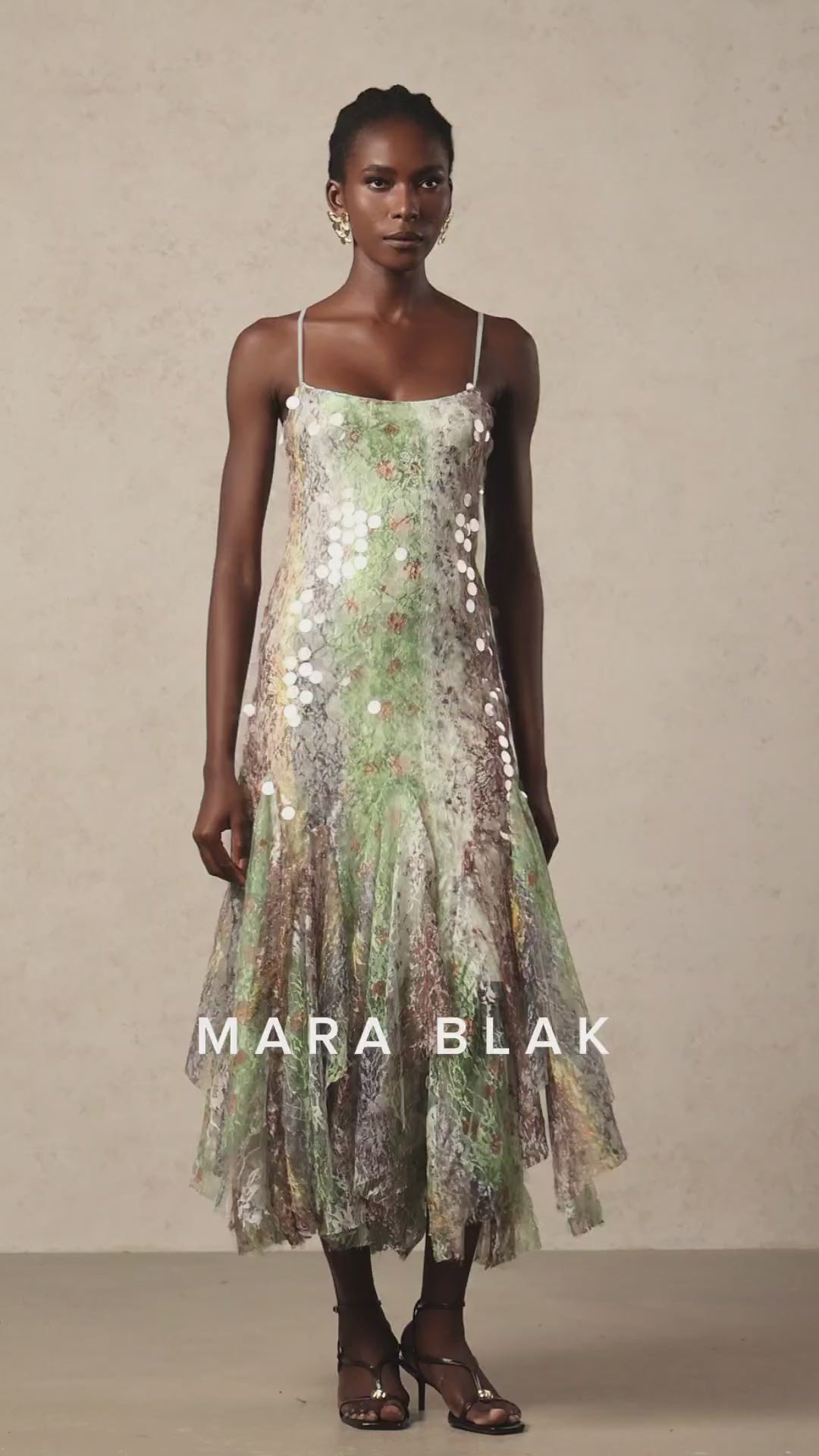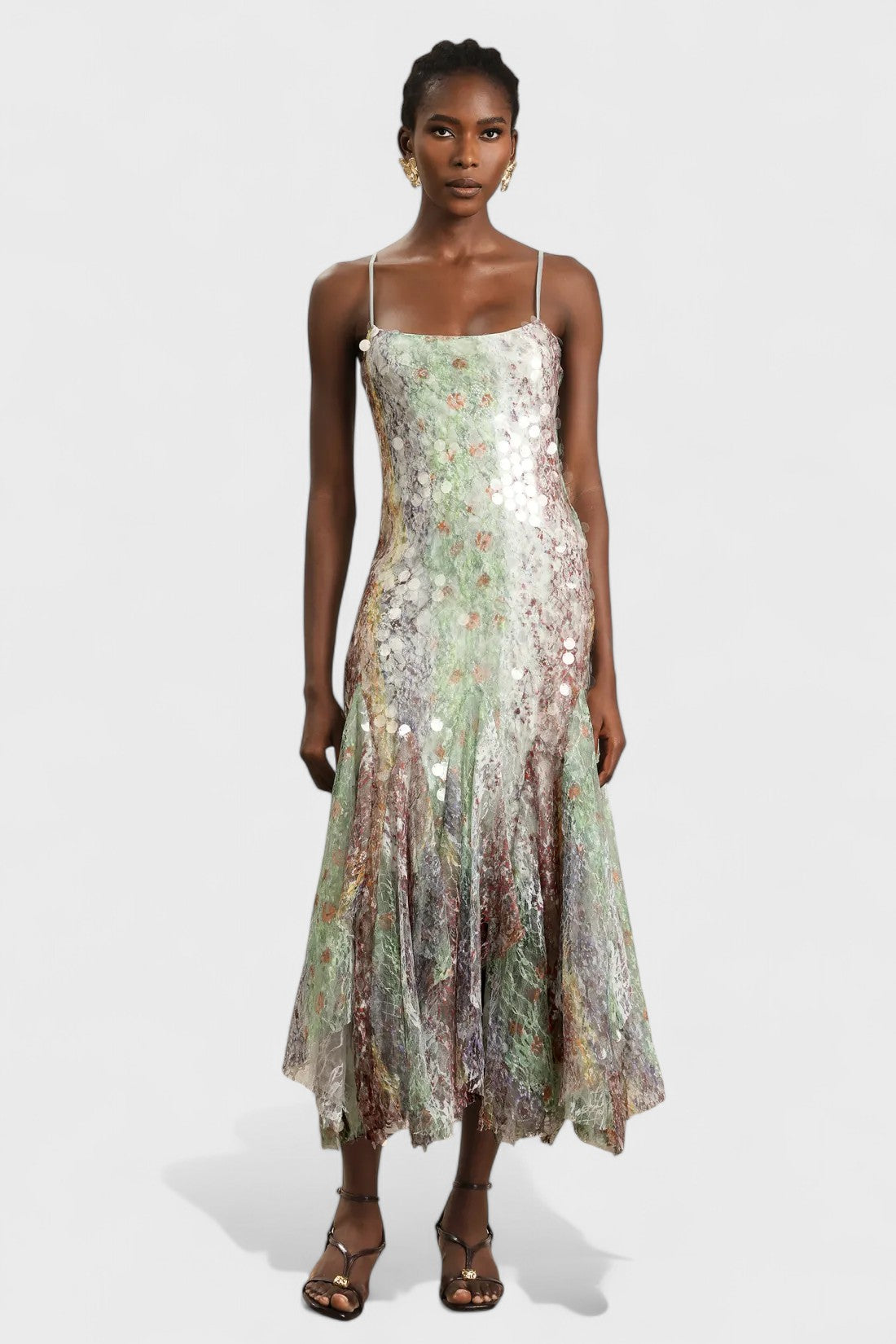 - Design/Features: Sleeveless, adjustable spaghetti straps, semi-fitted silhouette with flared hem, light floral pattern with iridescent sequins for dimensional shine