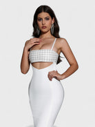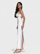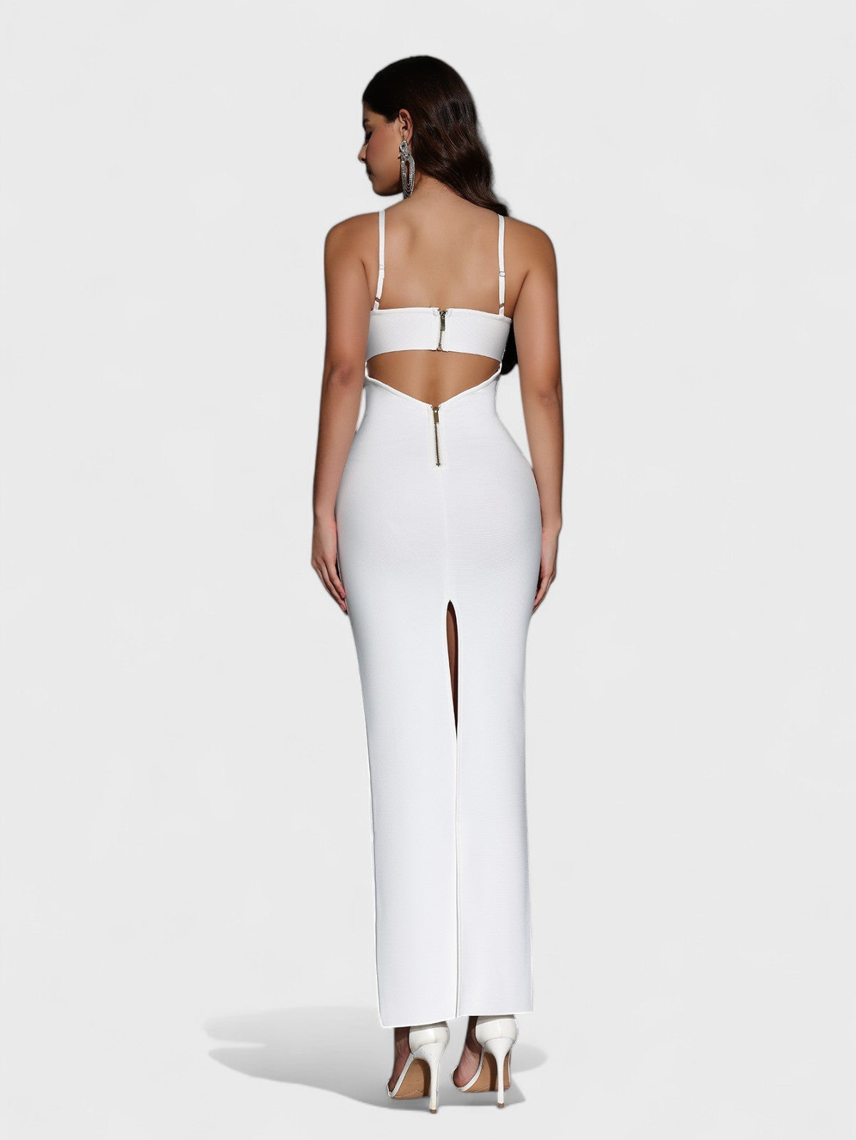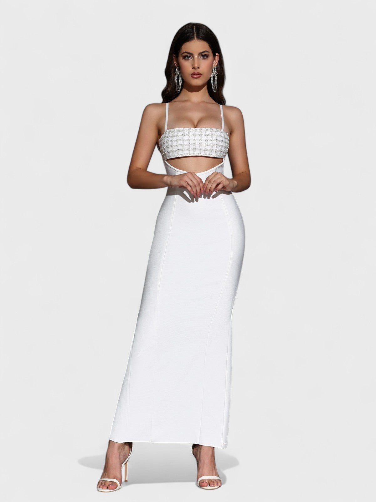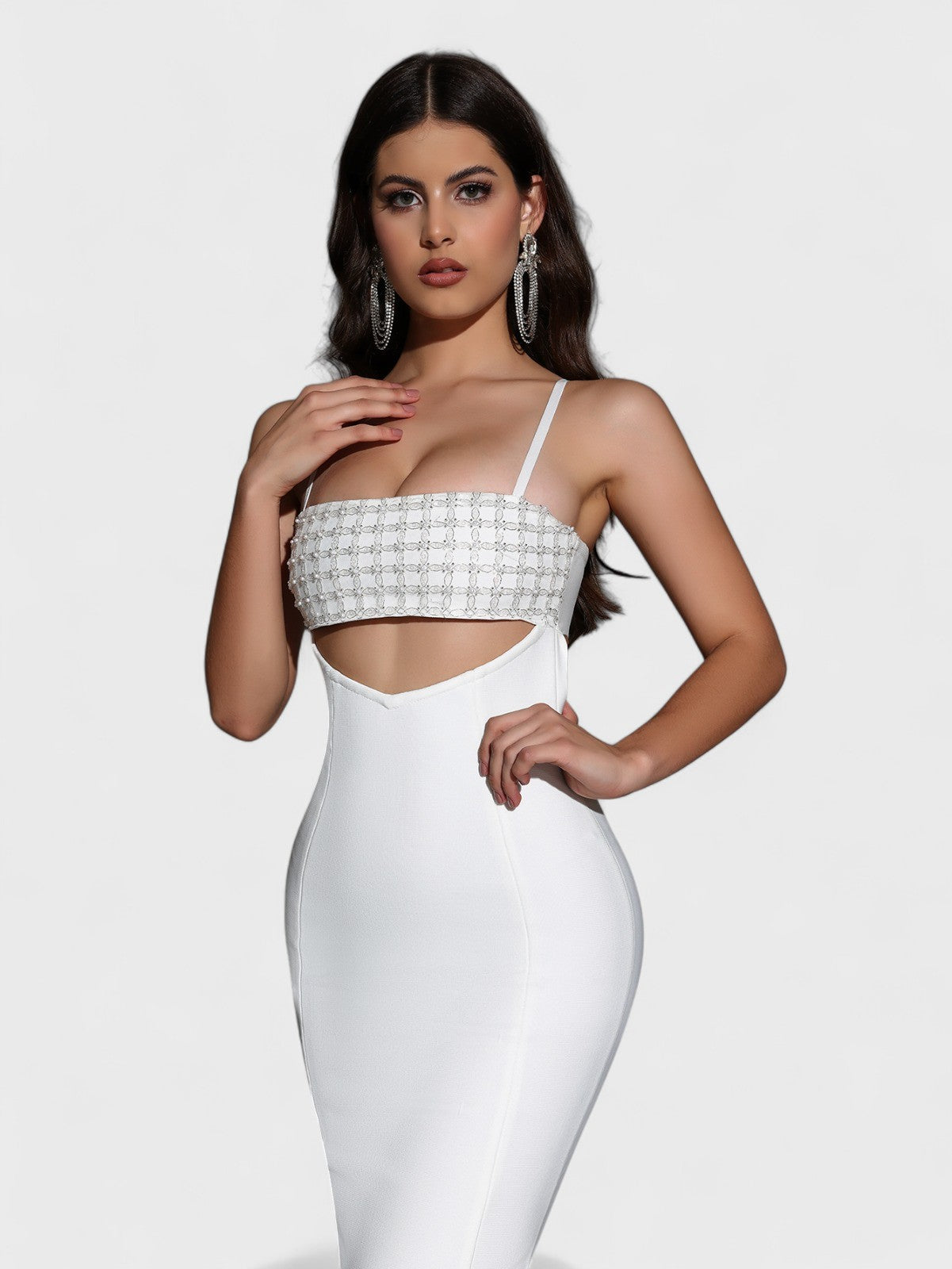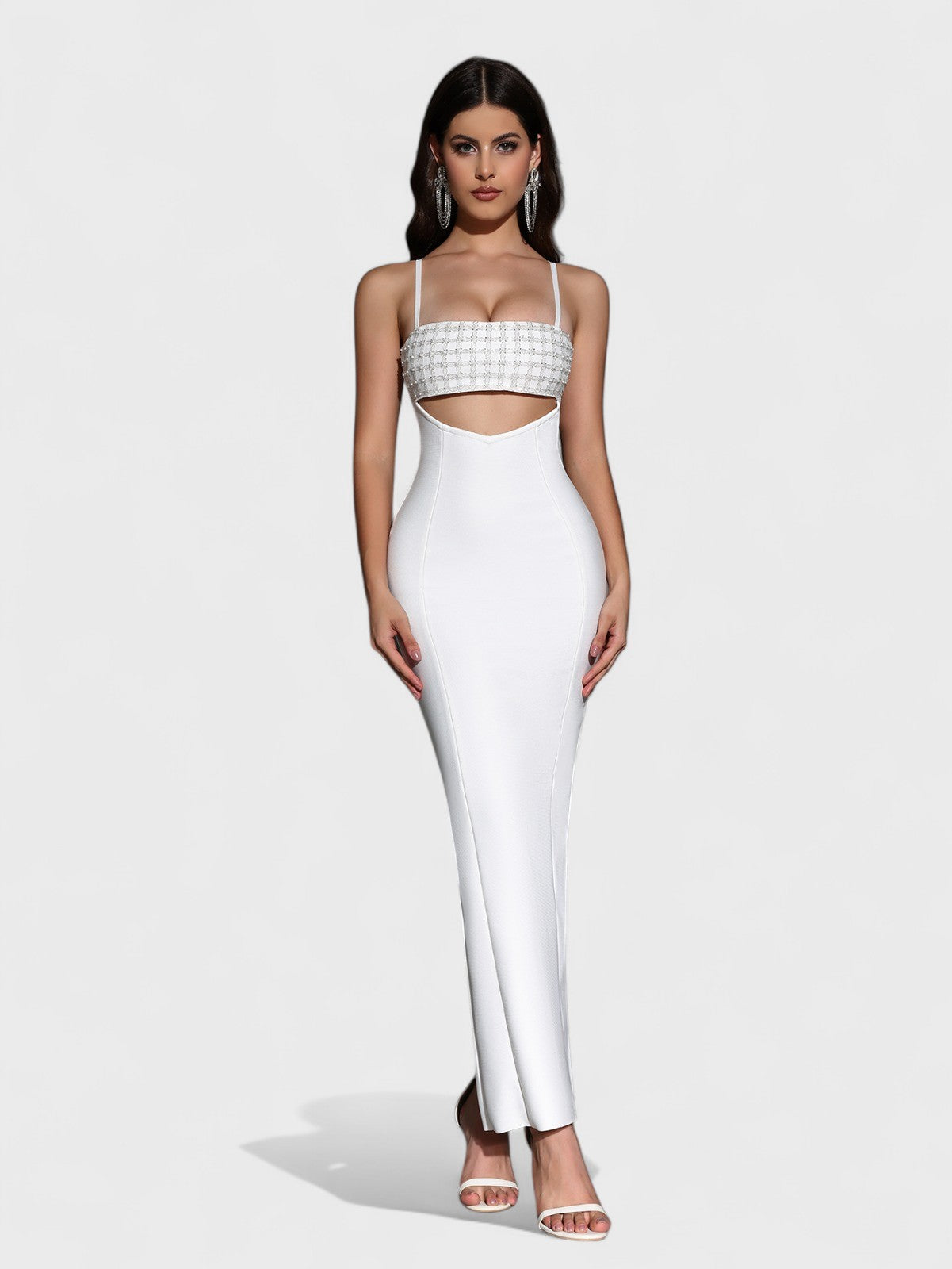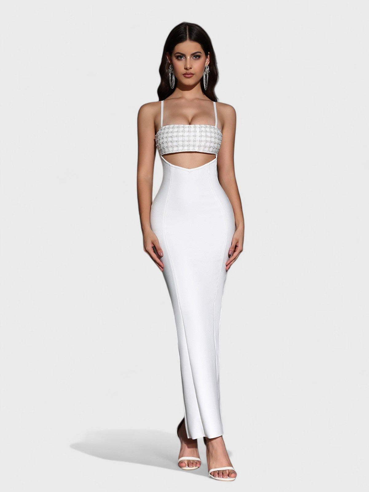 The Valeria Cut-Out Bandage Maxi Dress, designed with modern elegance and sculpting fit. The beaded bandeau-style bodice adds glamour, while the daring cut-out front and open back detail create a sultry, confident silhouette. Crafted in our signature high-stretch bandage fabric, this dress hugs your curves and moves with you for the perfect fit.