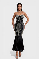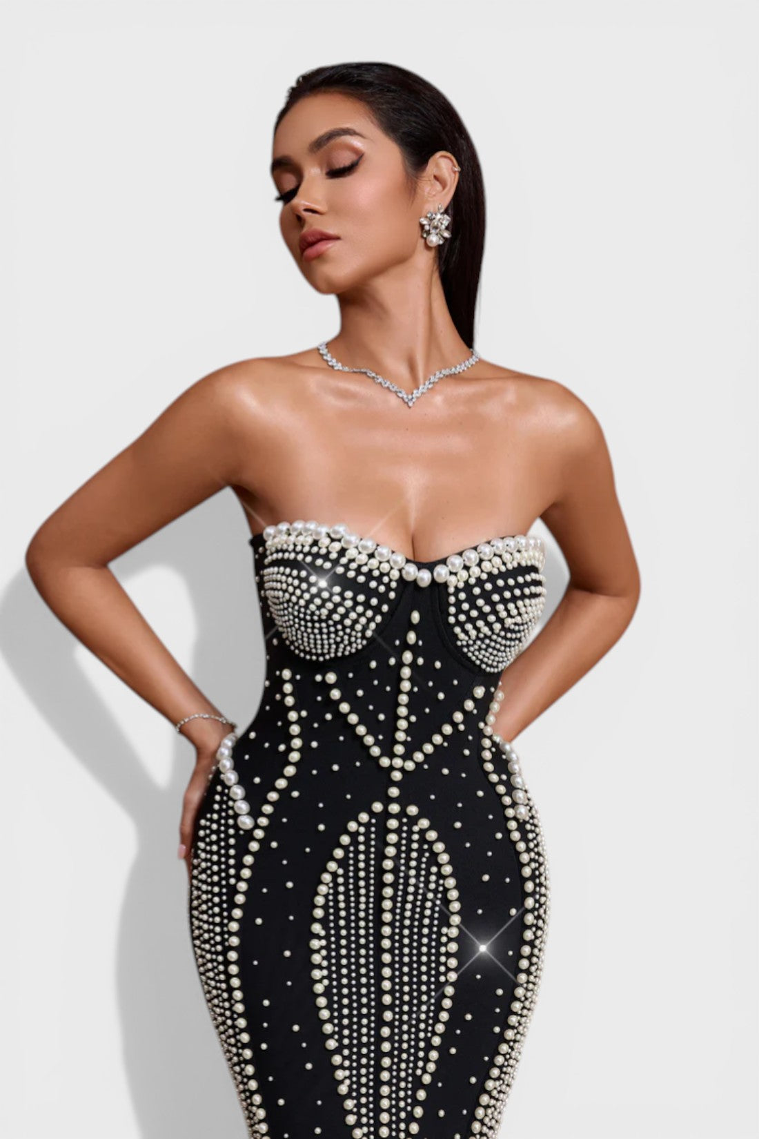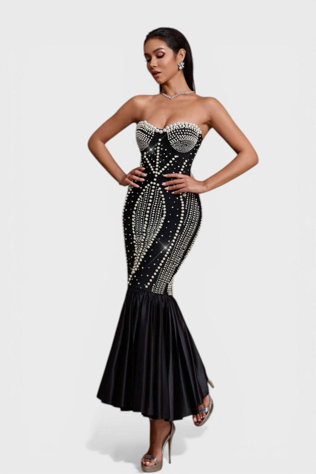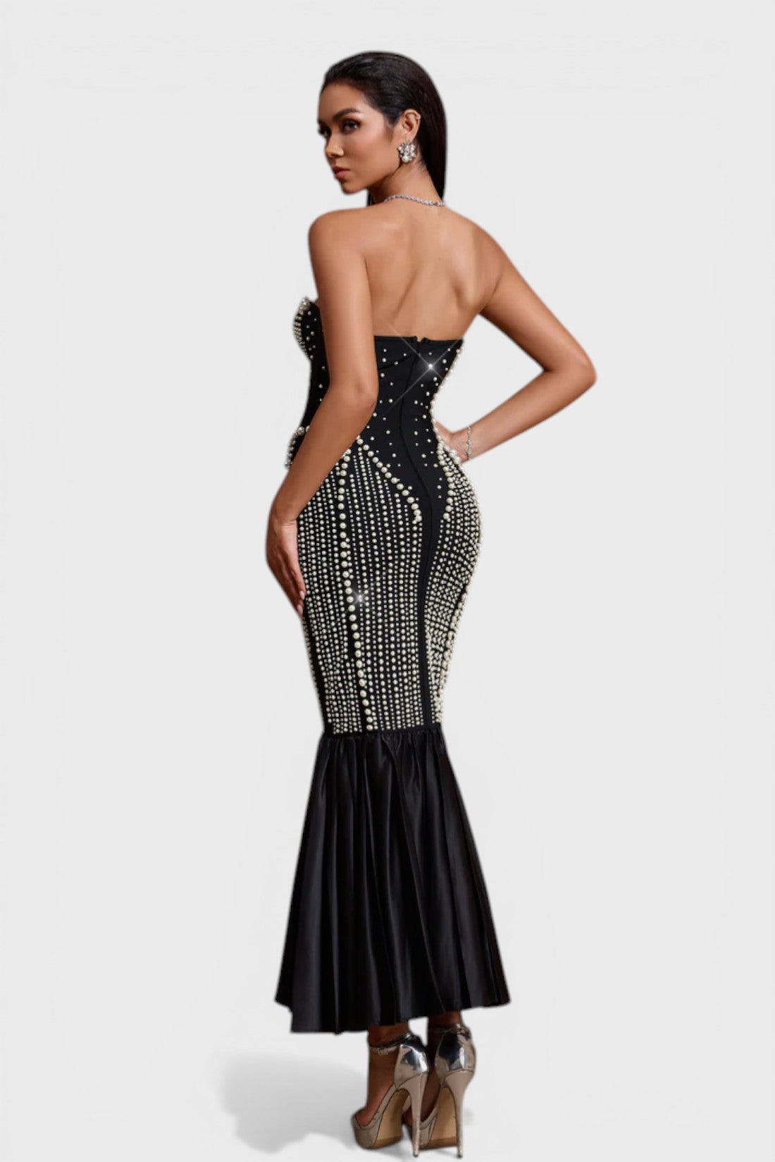 Treten Sie ein in Eleganz mit diesem atemberaubenden, mit Strasssteinen besetzten Maxikleid. Der trägerlose Sweetheart-Ausschnitt betont wunderschön die Schultern und das Schlüsselbein, während die durchgehenden Strasssteine einen strahlenden Glanz verleihen. Perfekt für jeden besonderen Anlass, ist dieses Kleid darauf ausgelegt, einen bleibenden Eindruck zu hinterlassen.