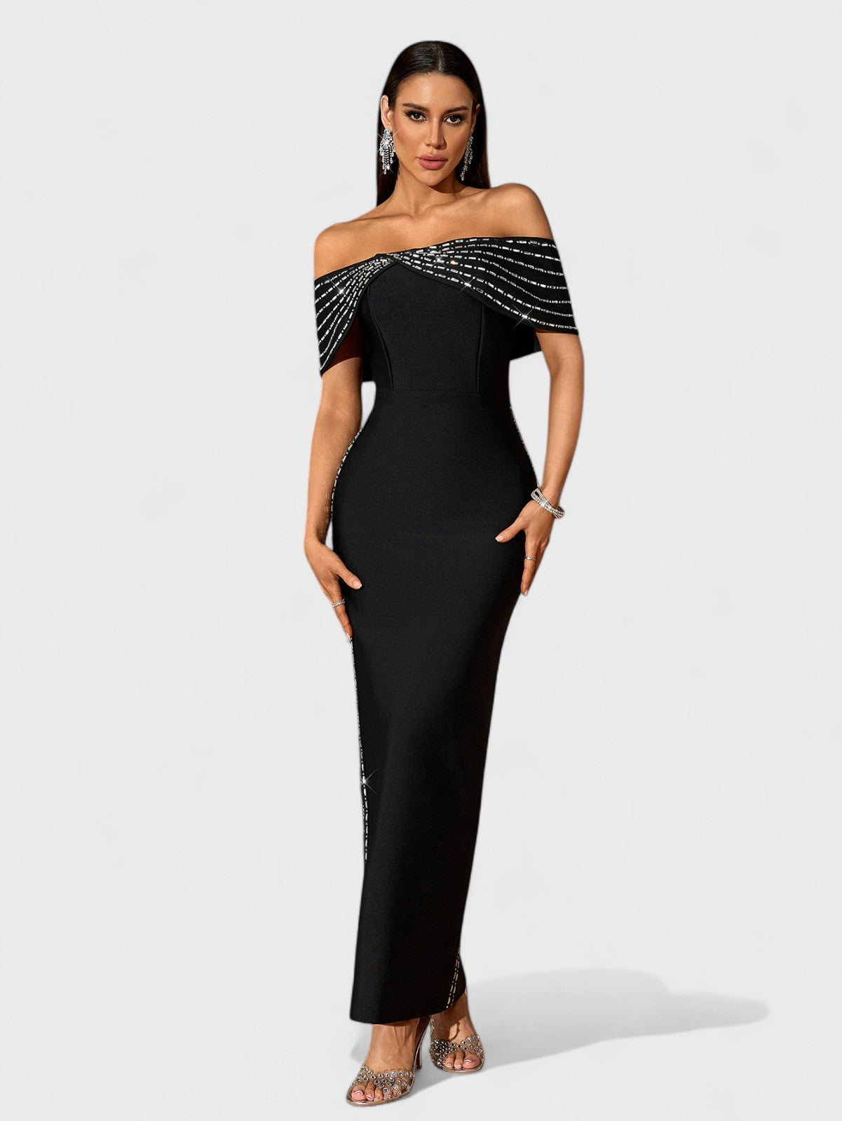 The Elqenna Off-Shoulder Embellished Maxi Dress. Featuring an off-shoulder neckline with a draped, embellished overlay, this dress highlights the shoulders while maintaining a sleek, fitted silhouette. Rhinestone detailing continues down the sides, adding sparkle and elongating the figure. Perfect for galas, black-tie events, or any special occasion where elegance is key.
