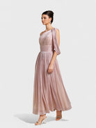 Gracioso y refinado, el vestido Lucienne combina un diseño atemporal con detalles modernos. Este vestido midi en tono crema presenta un corsé inspirado en el busto adornado con delicados detalles de piedras preciosas que resaltan el busto, la cintura y los tirantes. La falda fluida en línea A añade un movimiento suave, haciéndolo perfecto para fiestas en el jardín, eventos nupciales o celebraciones especiales.