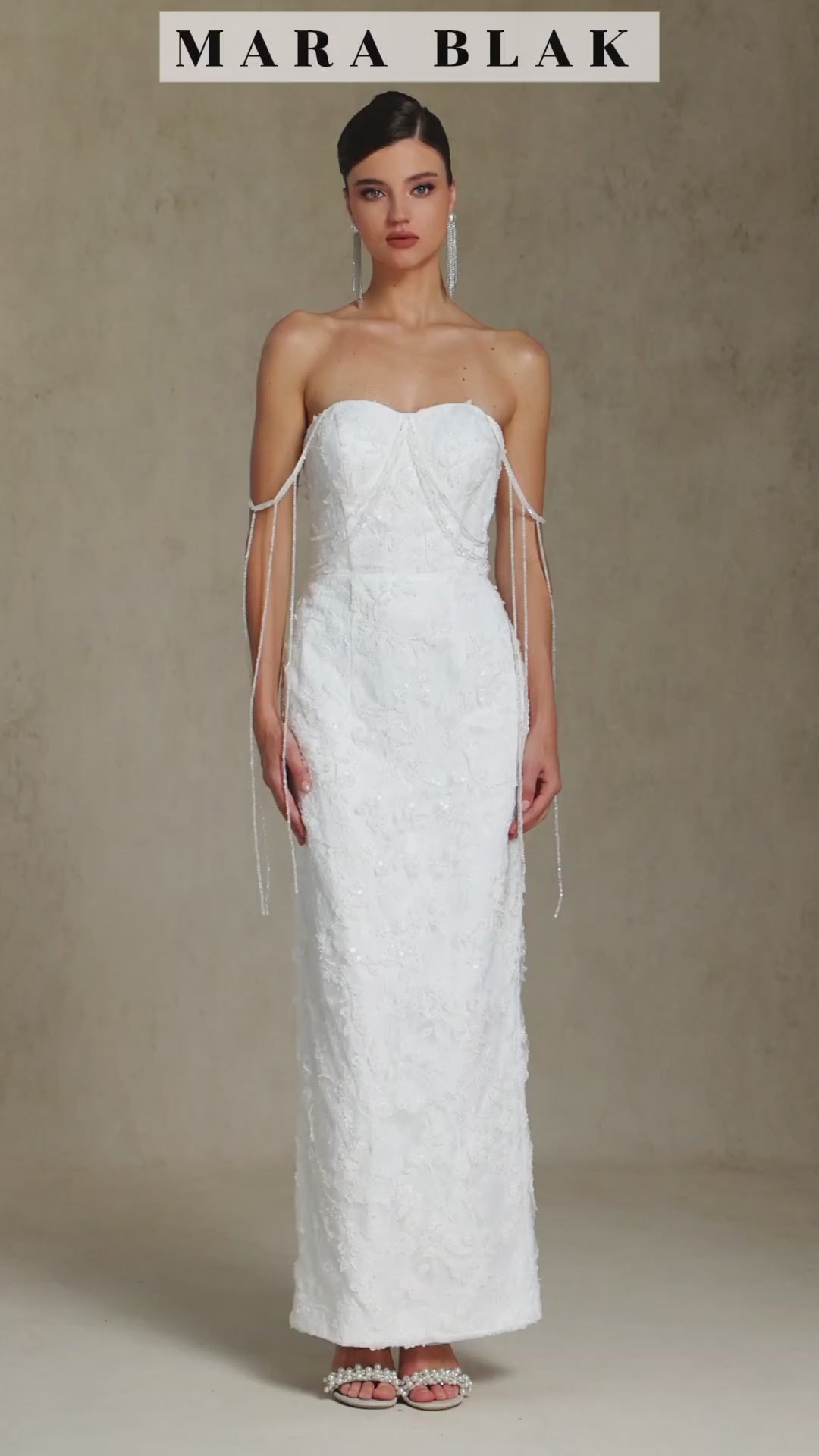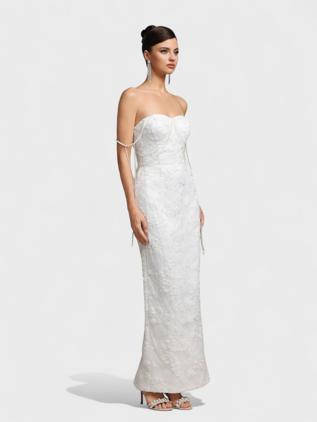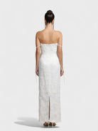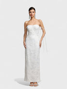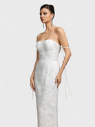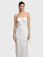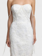 Gracioso y refinado, el vestido Lucienne combina un diseño atemporal con detalles modernos. Este vestido midi en tono crema presenta un corsé inspirado en el busto adornado con delicados detalles de piedras preciosas que resaltan el busto, la cintura y los tirantes. La falda fluida en línea A añade un movimiento suave, haciéndolo perfecto para fiestas en el jardín, eventos nupciales o celebraciones especiales.