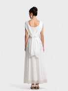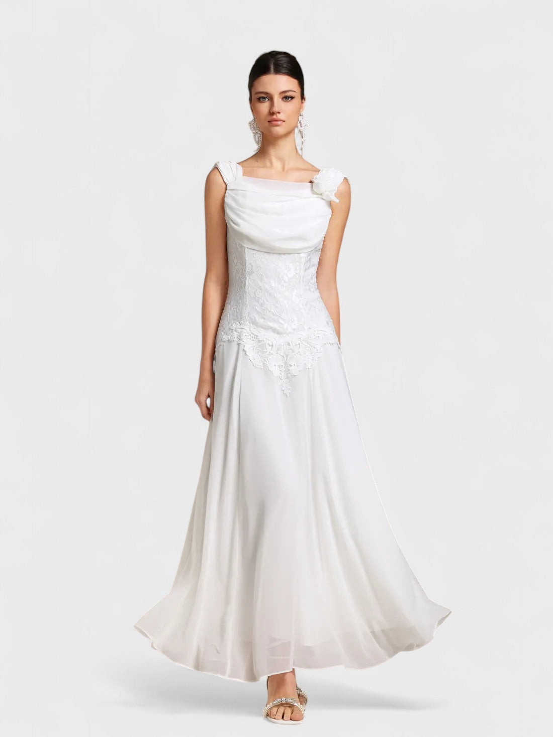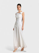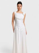 Gracioso y refinado, el vestido Lucienne combina un diseño atemporal con detalles modernos. Este vestido midi en tono crema presenta un corsé inspirado en el busto adornado con delicados detalles de piedras preciosas que resaltan el busto, la cintura y los tirantes. La falda fluida en línea A añade un movimiento suave, haciéndolo perfecto para fiestas en el jardín, eventos nupciales o celebraciones especiales.