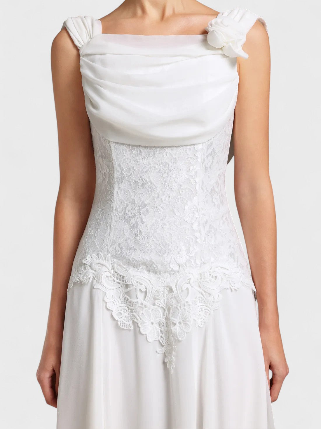 • Tela: Mezcla ligera de gasa con corsé estructurado y adornos