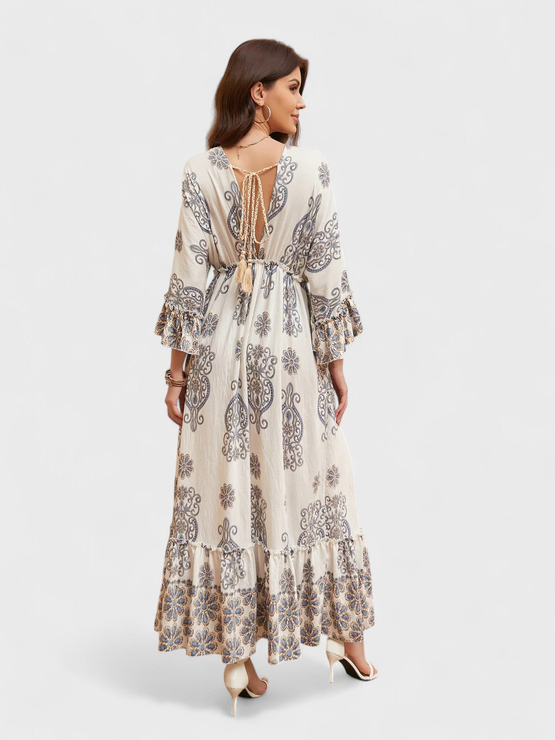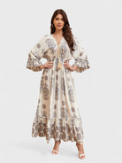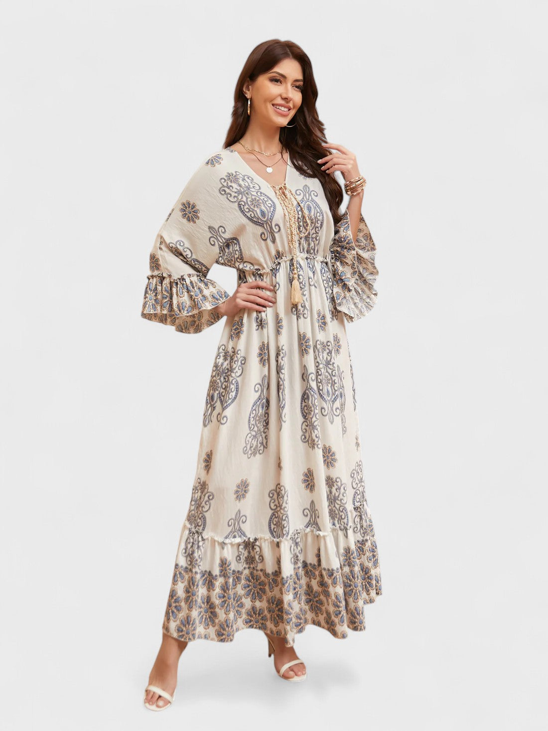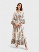 Una fusión cautivadora de color y elegancia, este vestido maxi está diseñado para llamar la atención. El audaz estampado abstracto en amarillo, púrpura y granate se desliza por la suave tela plisada, creando un efecto fluido y dinámico. El escote corazón se realza con detalles fruncidos y una hilera cascada de adornos brillantes, añadiendo un toque de lujo. Las mangas largas de obispo con puños elásticos equilibran la silueta ajustada, mientras que el corpiño fruncido favorece la figura. La abertura alta asegura un movimiento elegante, haciendo que este vestido sea perfecto para eventos nocturnos, ocasiones especiales o cualquier momento que requiera un glamour sofisticado.