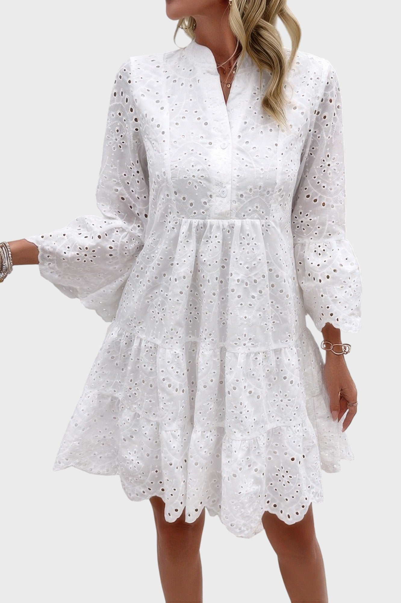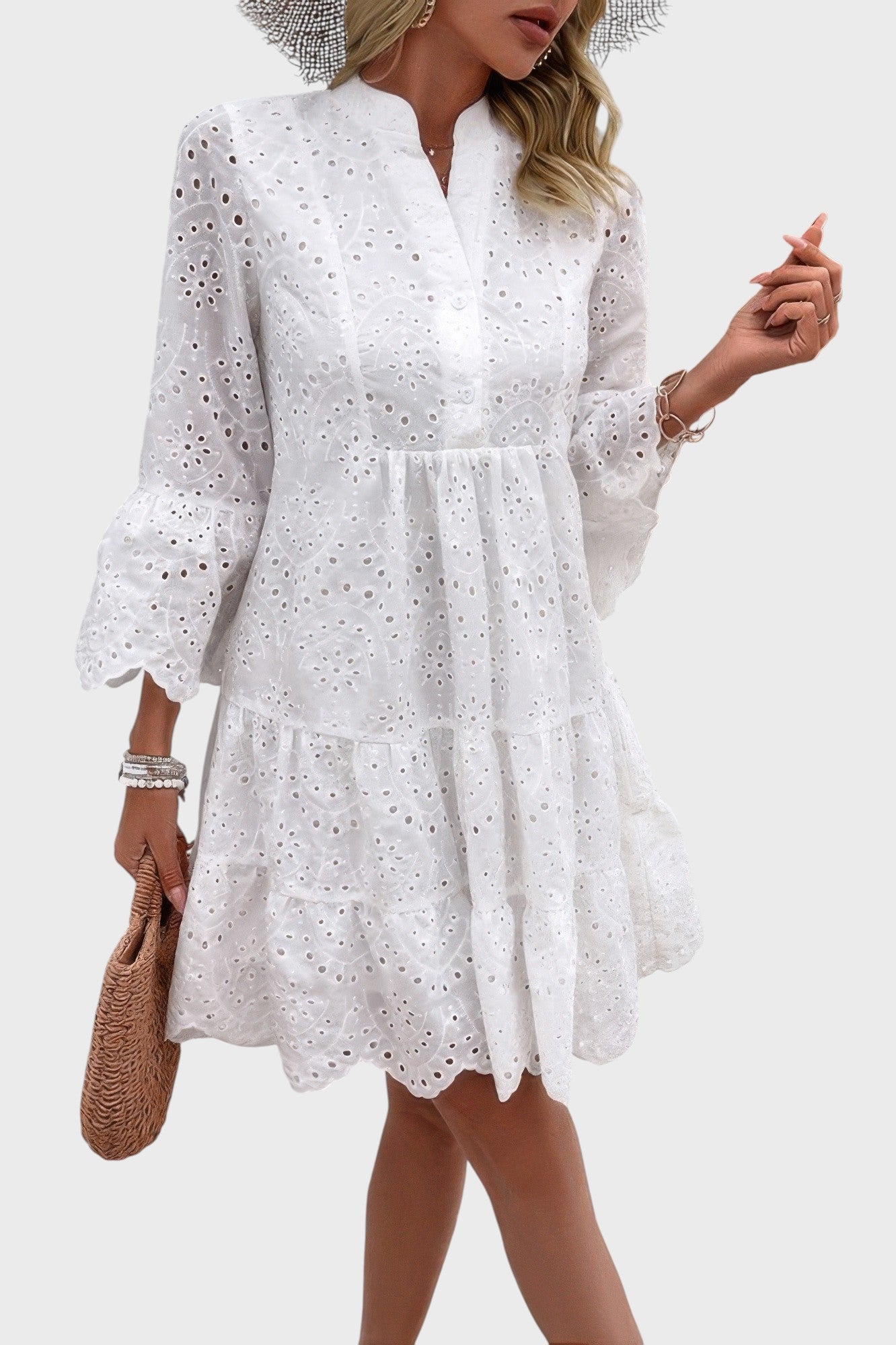 - Design/Features: Eyelet embroidery, V-split neckline, tiered skirt, three-quarter bell sleeves, scalloped hemline