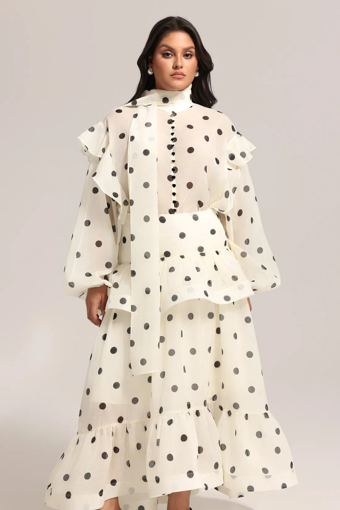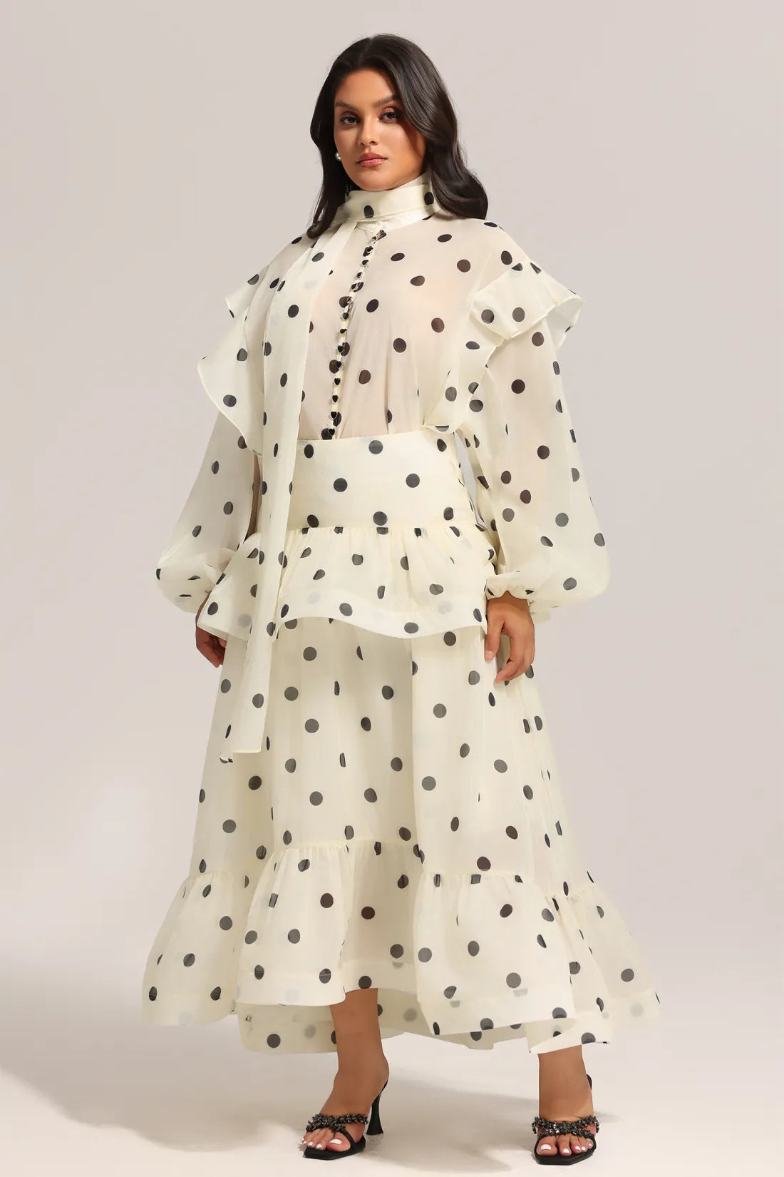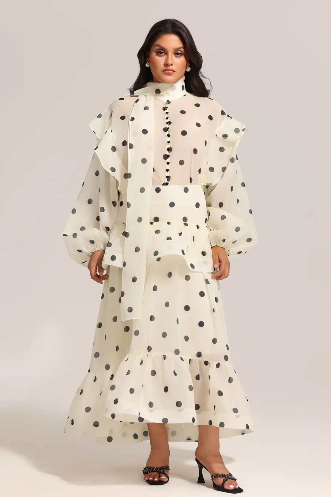 Ce superbe ensemble deux pièces à pois se compose d'un chemisier à col montant et manches longues à volants, ainsi que d'une jupe longue fluide à volants. Le chemisier en mousseline transparente est orné de délicats boutons, de manches flottantes et d'un élégant foulard. La jupe taille haute assortie, à la taille structurée et à la silhouette volumineuse, apporte une touche romantique.