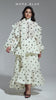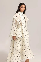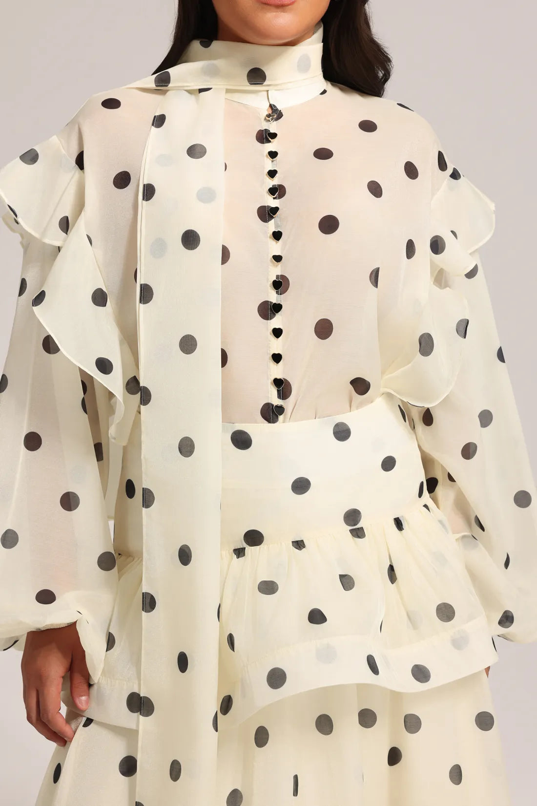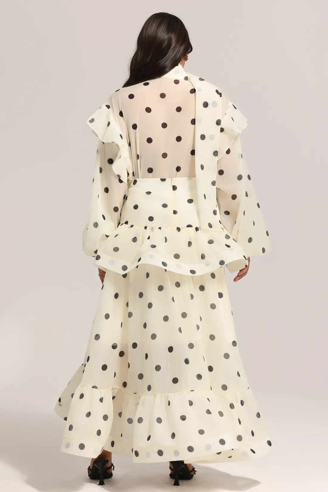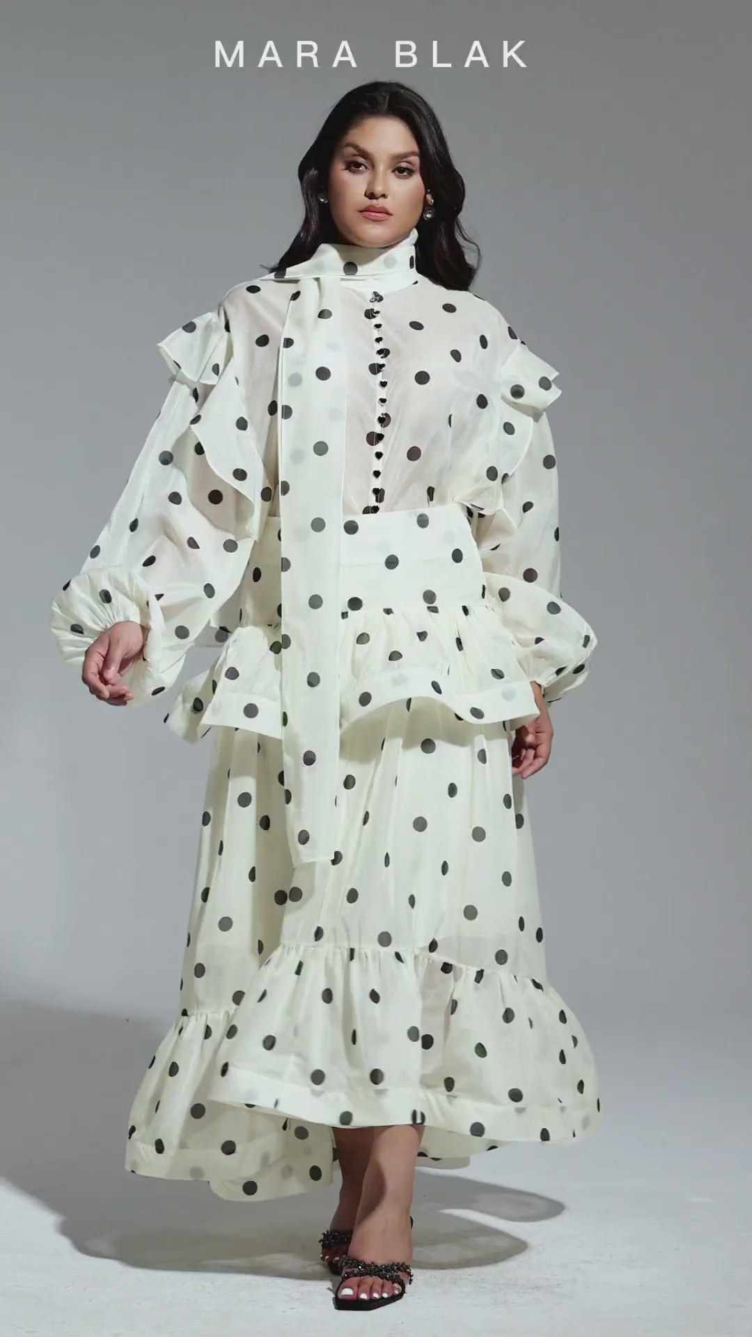 Ce superbe ensemble deux pièces à pois se compose d'un chemisier à col montant et manches longues à volants, ainsi que d'une jupe longue fluide à volants. Le chemisier en mousseline transparente est orné de délicats boutons, de manches flottantes et d'un élégant foulard. La jupe taille haute assortie, à la taille structurée et à la silhouette volumineuse, apporte une touche romantique.