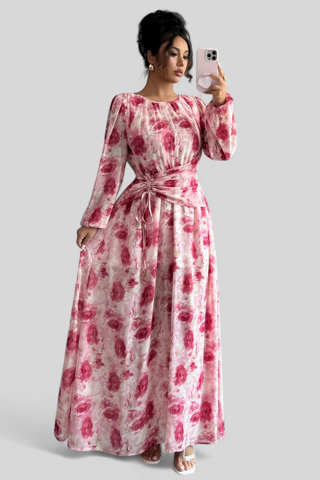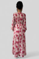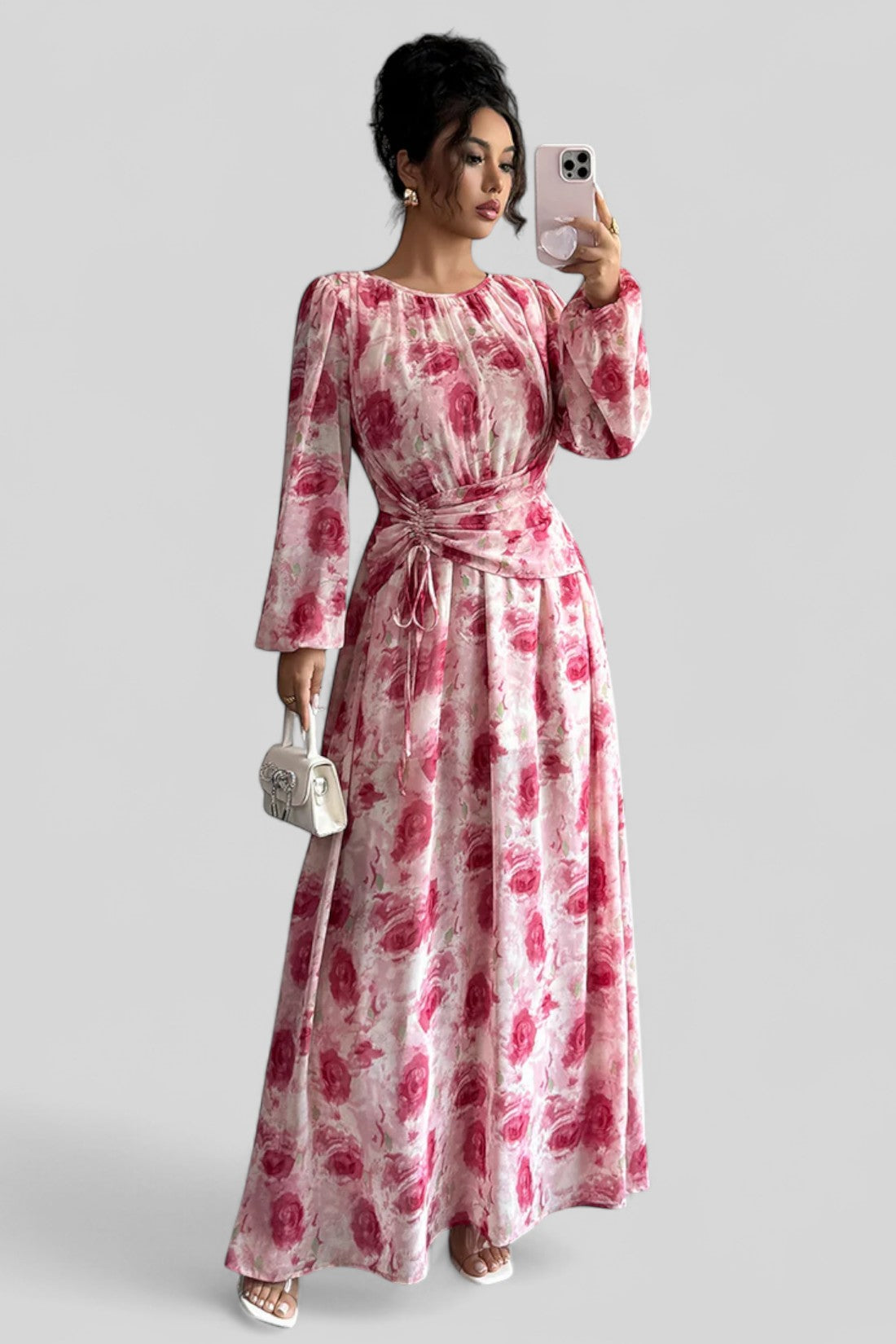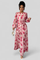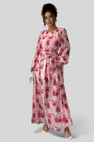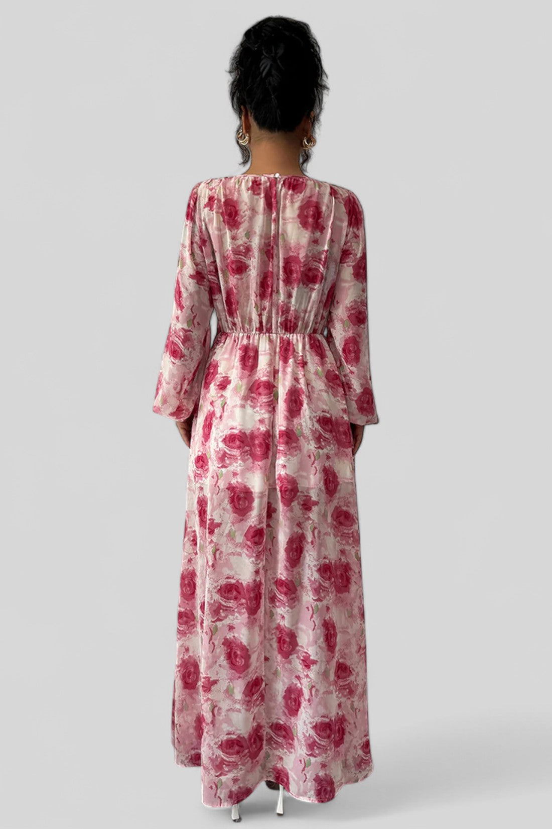 Fusion captivante de couleurs et d'élégance, cette robe longue est conçue pour se démarquer. Son imprimé abstrait audacieux, jaune, violet et bordeaux, tourbillonne sur un tissu plissé doux, créant un effet fluide et dynamique. Son décolleté en cœur est sublimé par des fronces et une cascade de strass scintillants, apportant une touche de luxe. De longues manches évasées à poignets élastiques équilibrent la silhouette ajustée, tandis que le corsage froncé flatte la silhouette. La fente haute assure une élégance fluide, rendant cette robe parfaite pour les soirées, les occasions spéciales ou tout moment de glamour sophistiqué.