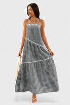 Casual yet effortlessly chic, the Amelia Dress is crafted in a lightweight gingham check for timeless summer style. Featuring slim spaghetti straps, a relaxed flowy silhouette, and tiered panels with subtle seam detailing, this maxi is perfect for weekend getaways, picnics, or beach strolls. Easy to dress up with wedges or keep relaxed with sandals.
