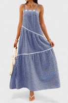 - Design/Features: Spaghetti straps, tiered skirt, gingham check print, relaxed fit, seam detailing for movement
