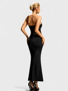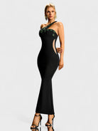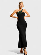 This sleek black maxi dress is a show-stopper, featuring a one-shoulder neckline adorned with shimmering green embellishments. The side cut-out detail adds a bold, contemporary edge, while the figure-hugging bandage fabric sculpts your silhouette. Perfect for evening events and glamorous occasions.