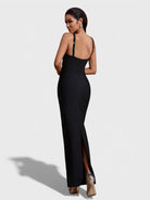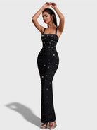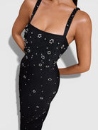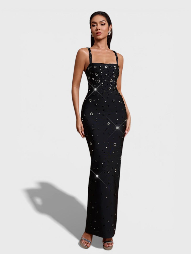 Il vestito Elena emana un fascino moderno con un tocco classico. Realizzato in tessuto fascia aderente, è adornato con scintillanti decorazioni in strass che catturano la luce a ogni movimento. Con scollo quadrato e spalline spesse per struttura, questa silhouette maxi elegante è perfetta per serate formali e occasioni raffinate.
