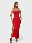 • 디자인: 스트랩 없는 스위트하트 네크라인, 시어 누드 메시와 스팽글 자수 오버레이, 몸에 꼭 맞는 실루엣, 탈착 가능한 긴 쉬폰 스카프