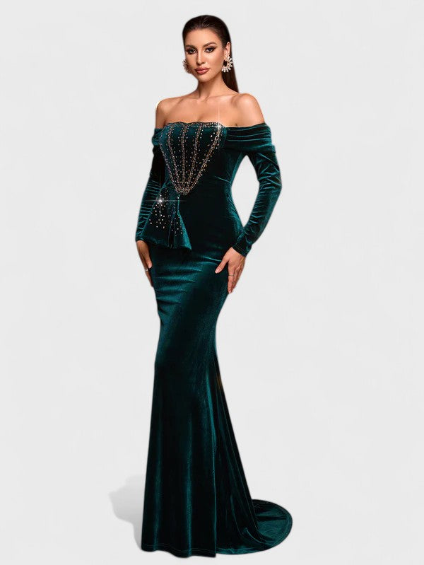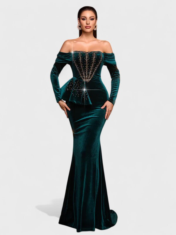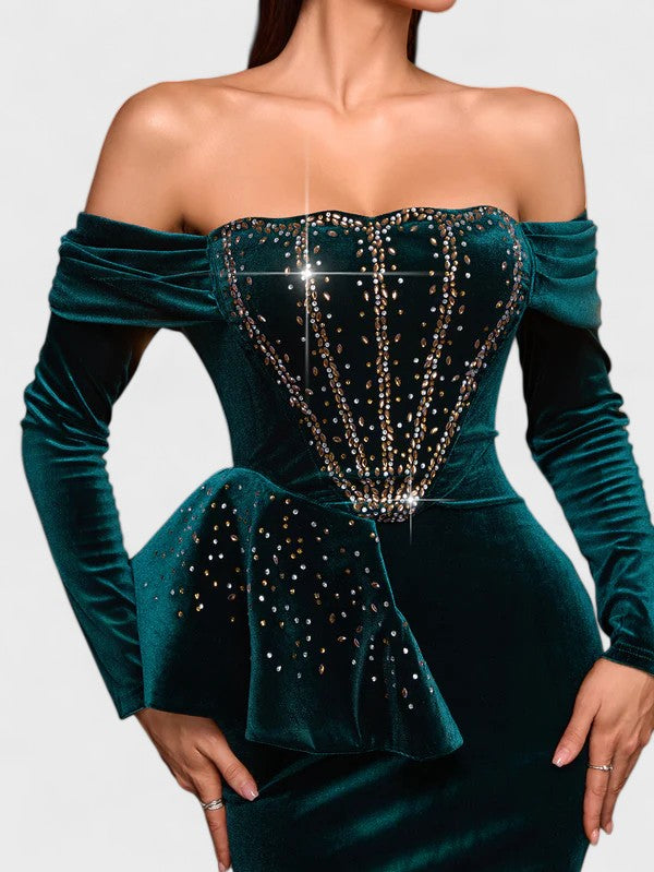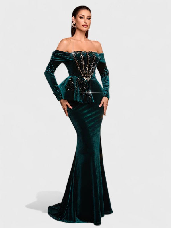 Designed in an enchanting emerald hue, this gown features an off-shoulder neckline, draped sleeves, and a sculpted peplum waist that accentuates the feminine form. The corset-inspired bodice is hand-embellished with shimmering crystals, creating a show-stopping sparkle against the deep velvet texture. Perfect for evening events, galas, or any occasion that calls for timeless sophistication.