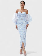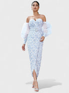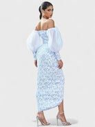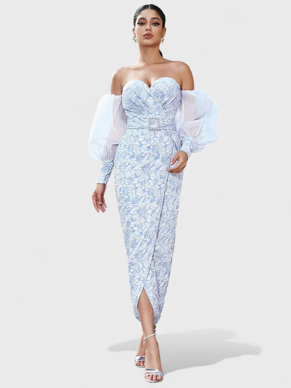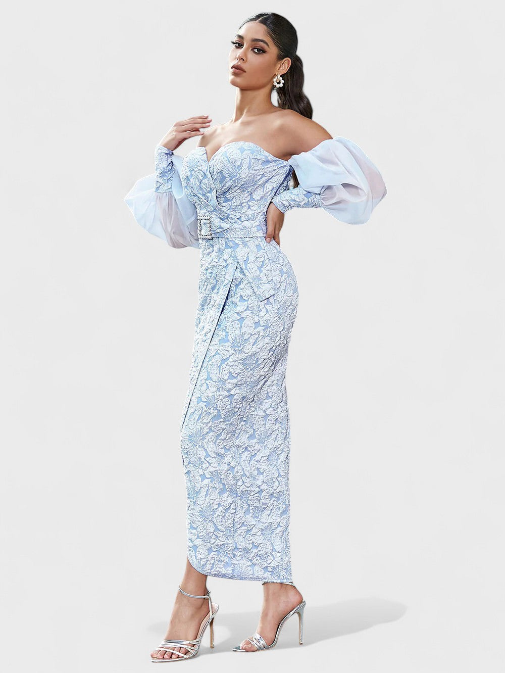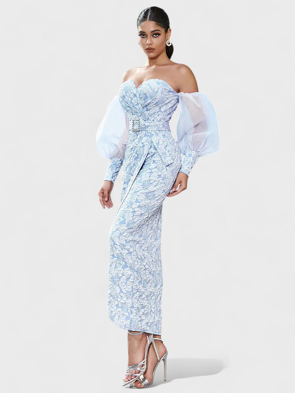 Designed in a luminous icy-blue embroidered fabric, this off-shoulder midi features a sculpted sweetheart neckline, dramatic sheer lantern sleeves, and a crystal-embellished belt that defines the waist. Perfect for formal occasions, engagement parties, or any event where sophistication is key.
