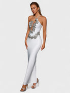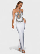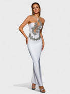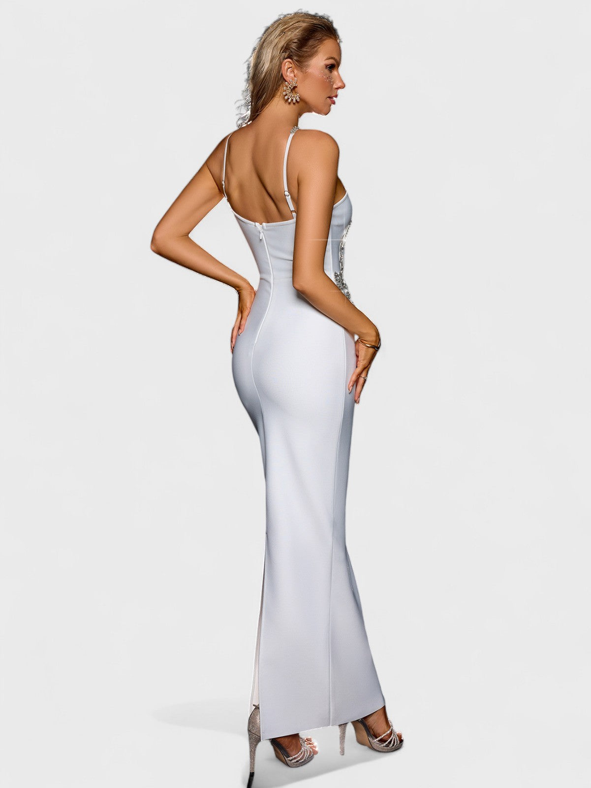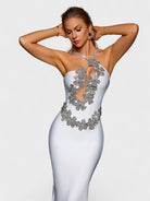 Gracieus en verfijnd, de Lucienne-jurk combineert tijdloos design met moderne details. Deze midi-jurk in crèmekleur heeft een korset-geïnspireerd lijfje afgezet met delicate edelsteenversieringen die de borst, taille en bandjes accentueren. De vloeiende A-lijn rok zorgt voor zachte beweging, waardoor hij perfect is voor tuinfeesten, bruiloftsevenementen of speciale vieringen.