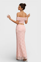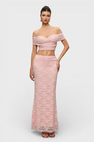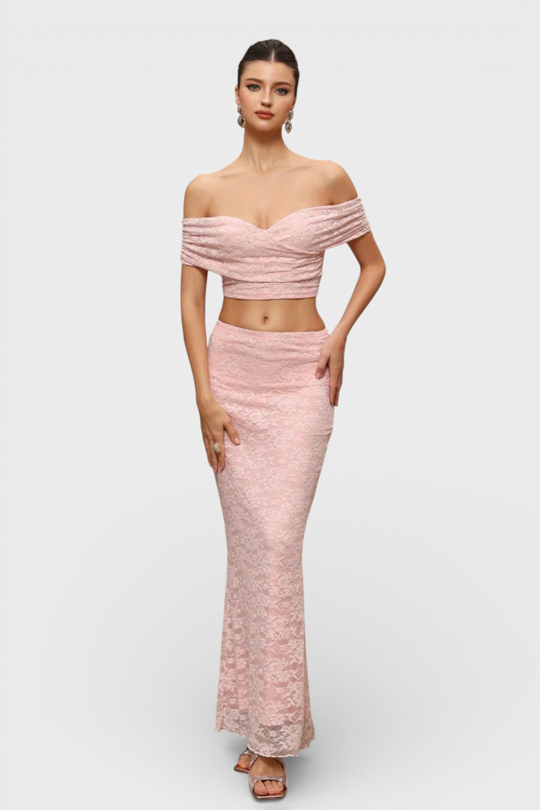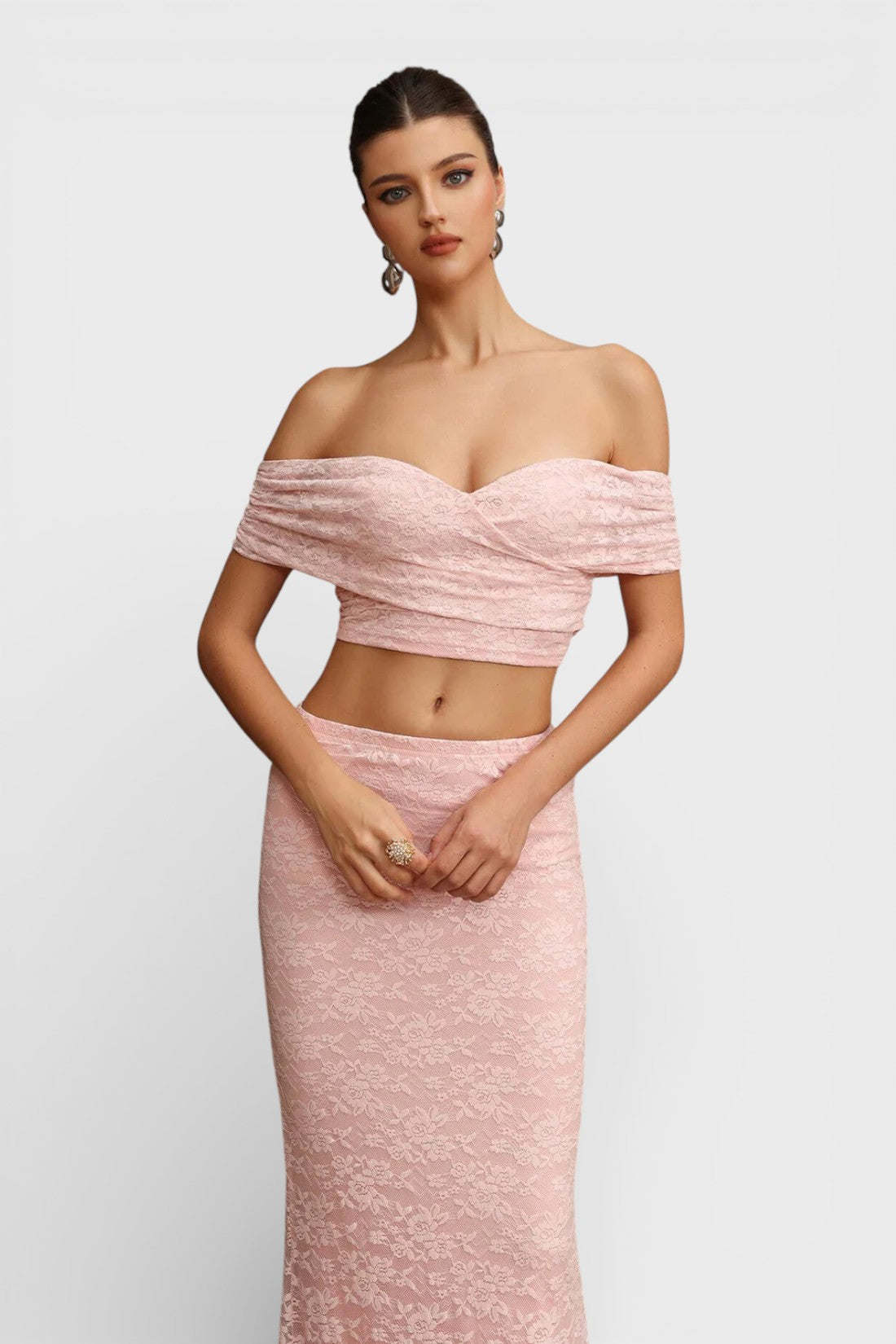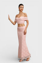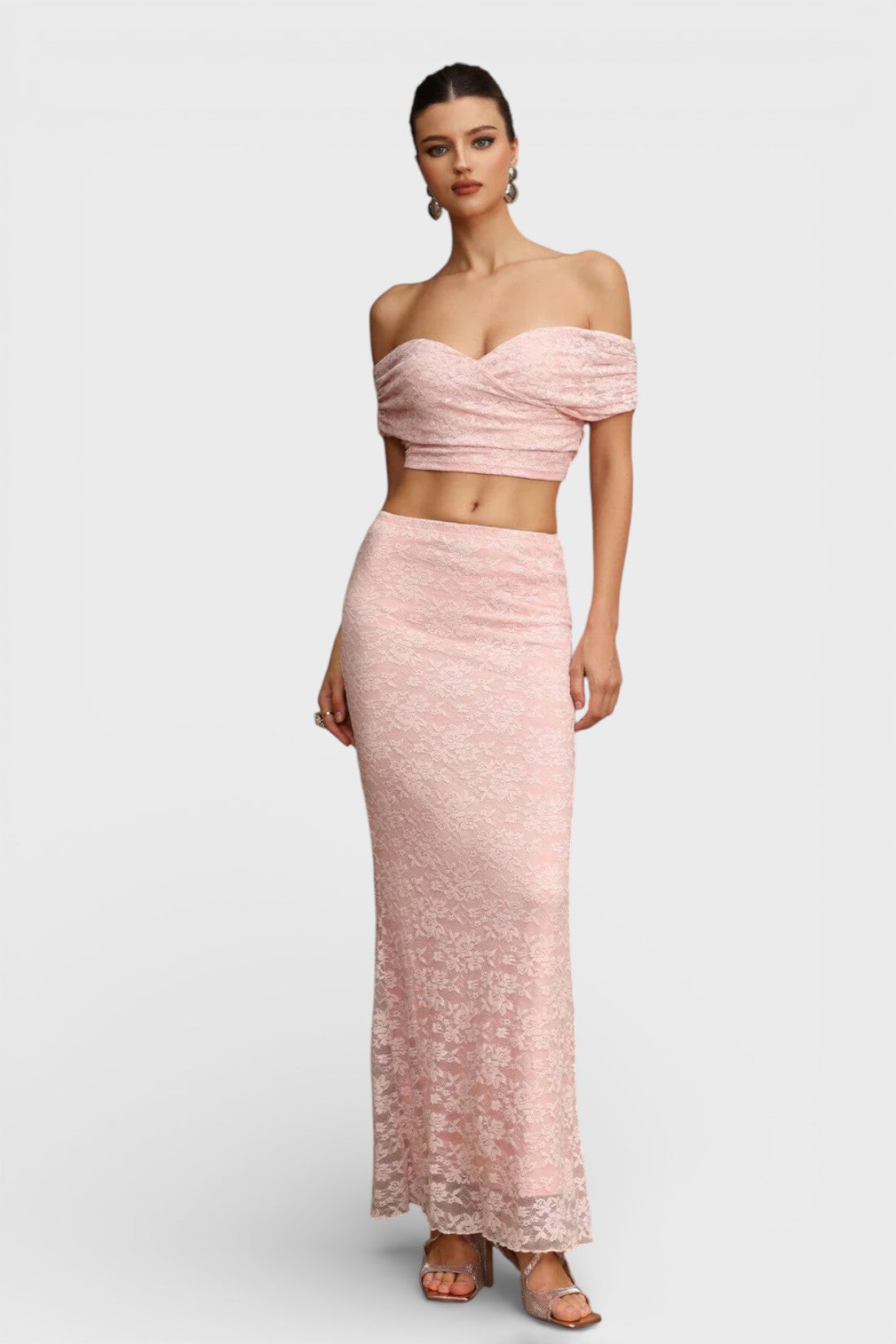 一款结构感蕾丝西装外套,配有深V领口、波浪形翻领和精致的长袖。收腰设计由光滑的缎带突出,增添优雅的轮廓。配套蕾丝宽腿裤自然垂坠,呈现优雅飘逸的效果。